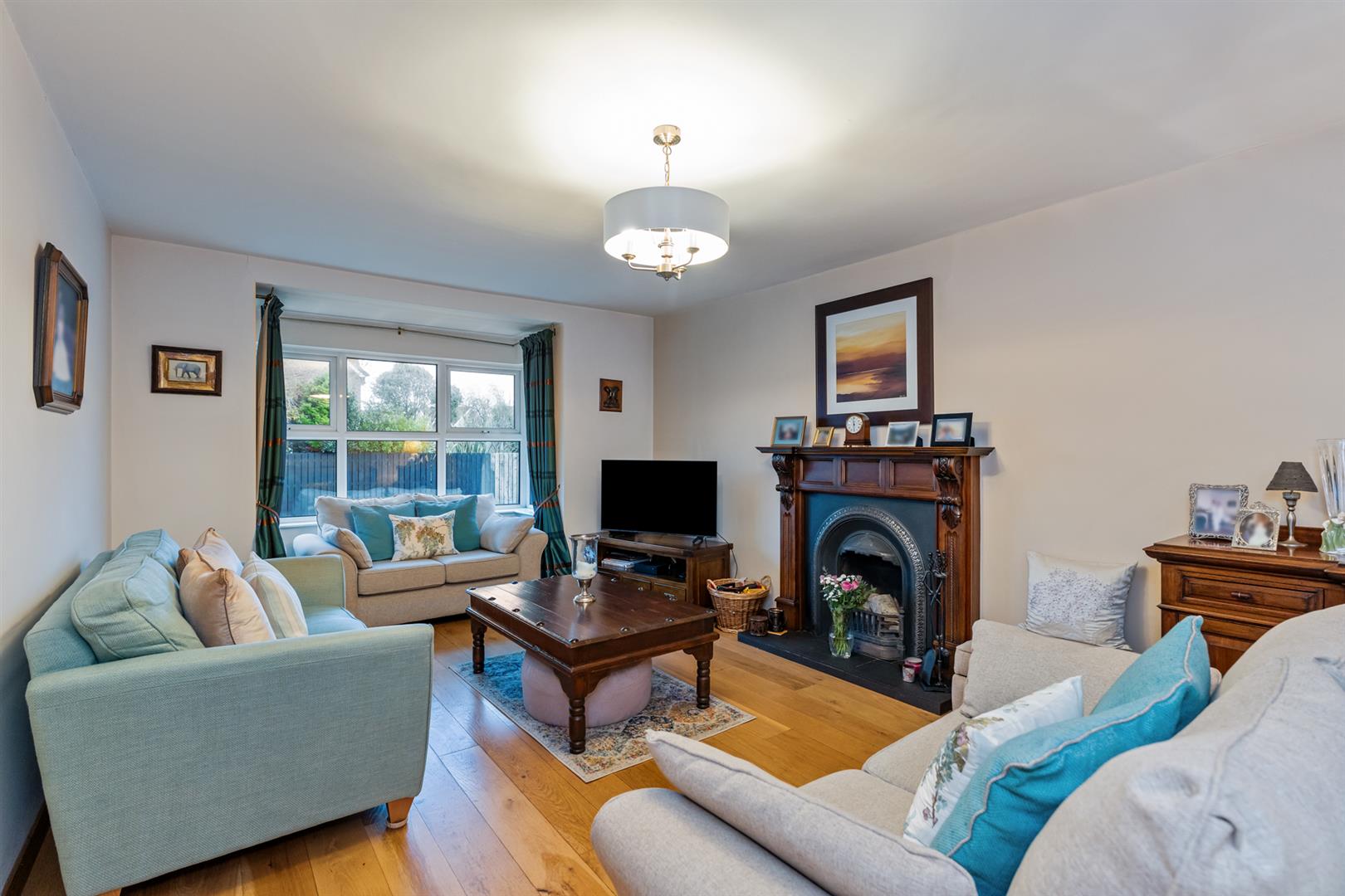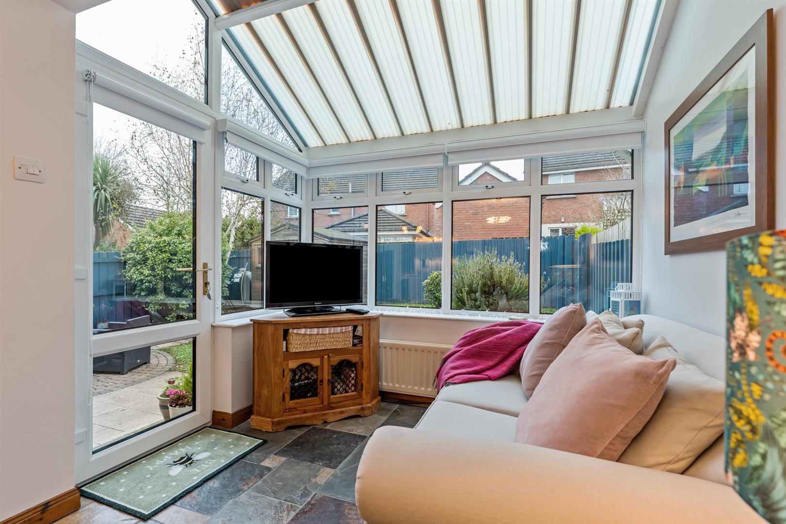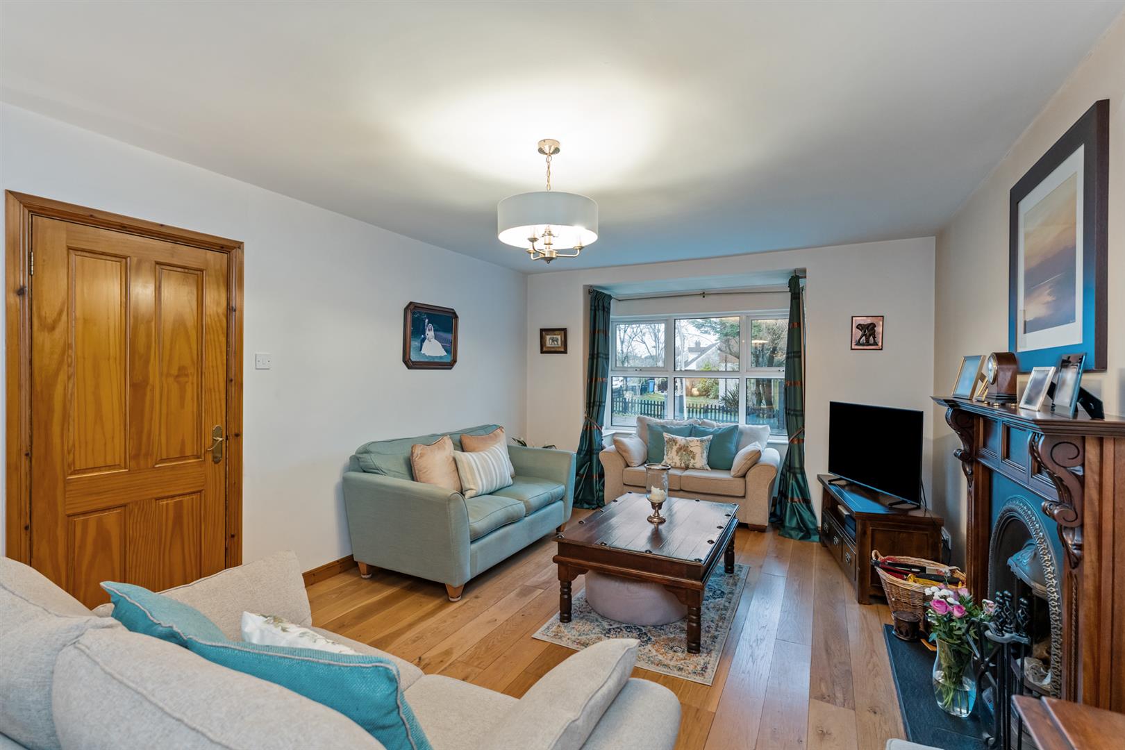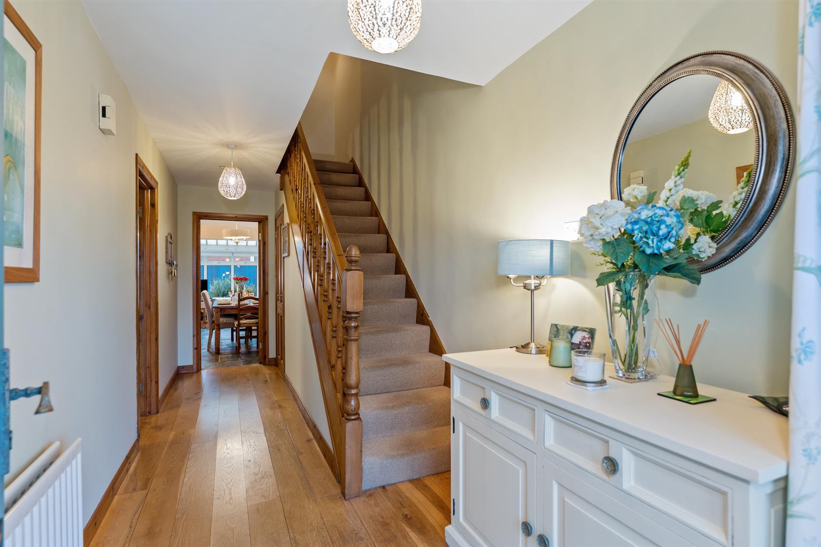 15 Garret Rocks is a well-presented semi-detached home offering practical space, quality finishes and a convenient Donaghadee location. The entrance hall features reclaimed solid oak flooring and understairs storage, leading to a bright lounge over 21 feet long with a cast iron fireplace, carved wood surround and matching oak flooring.