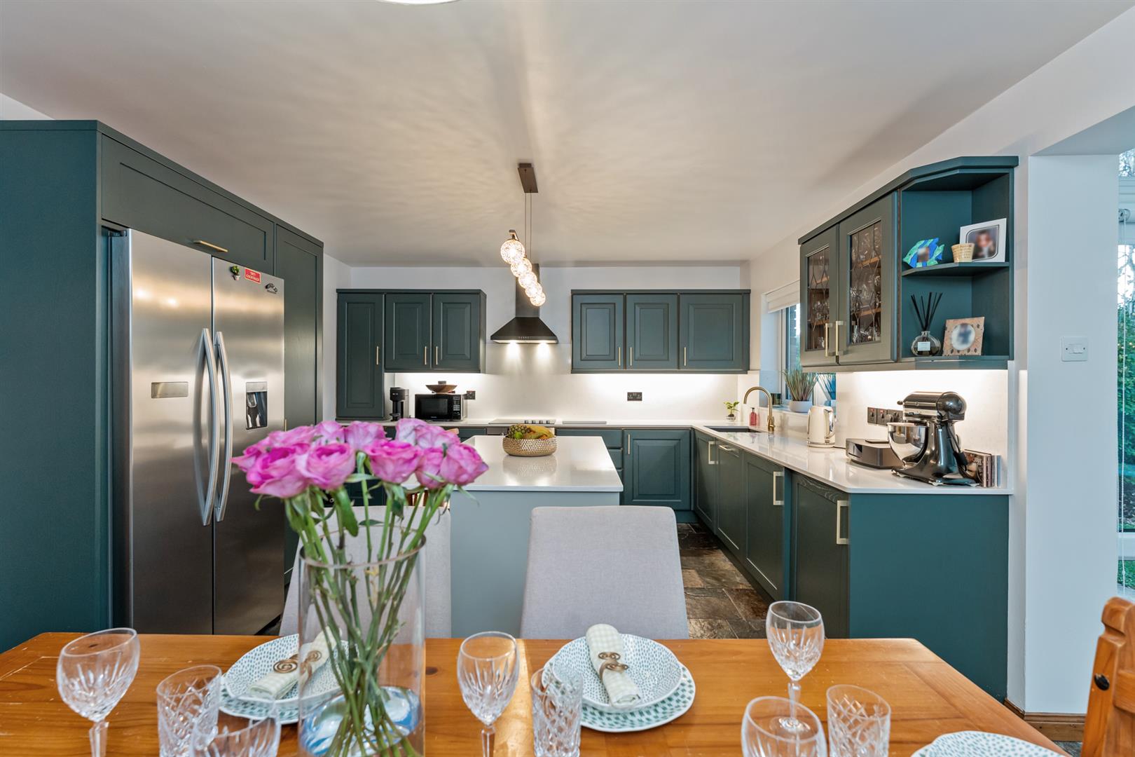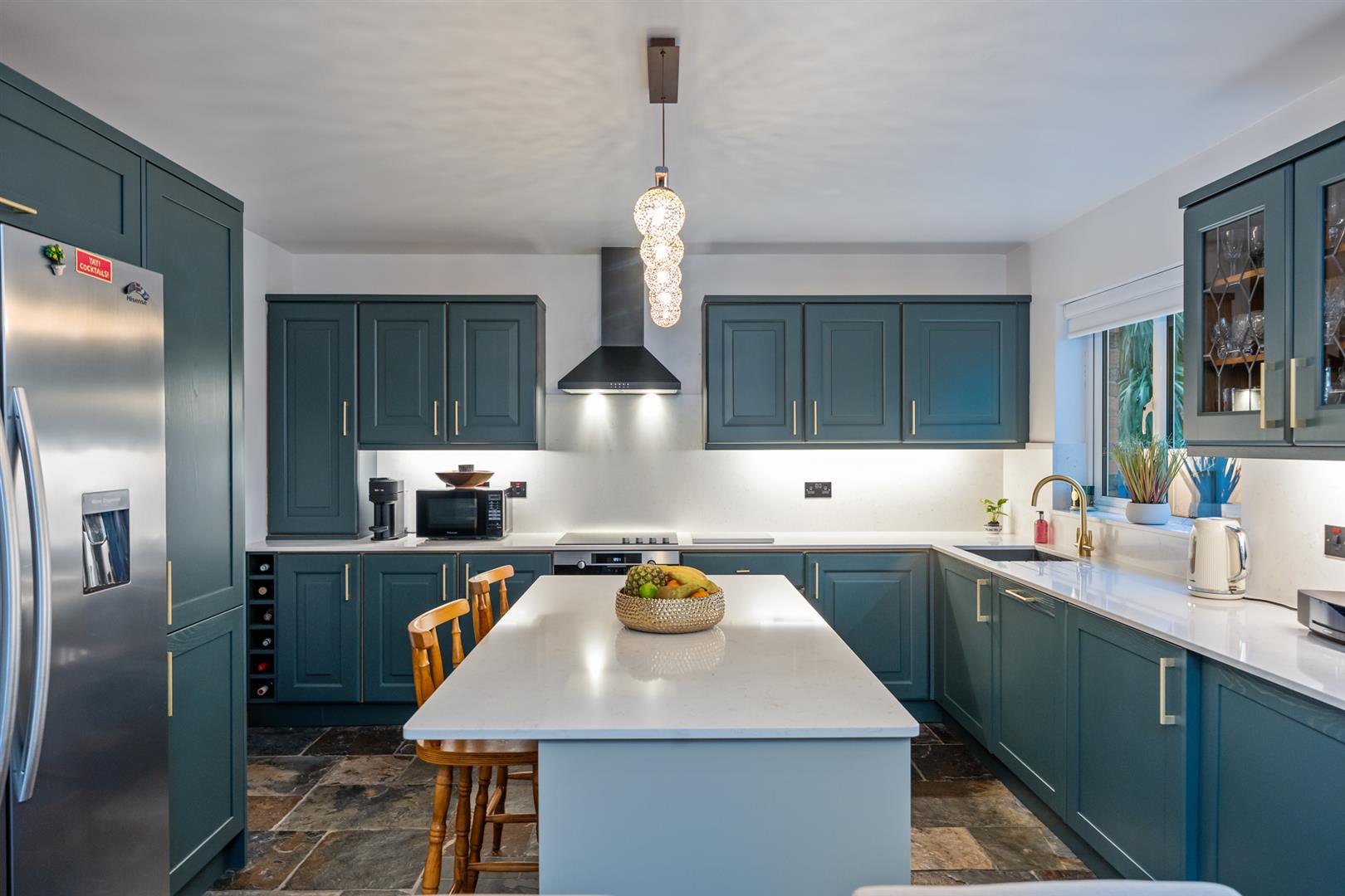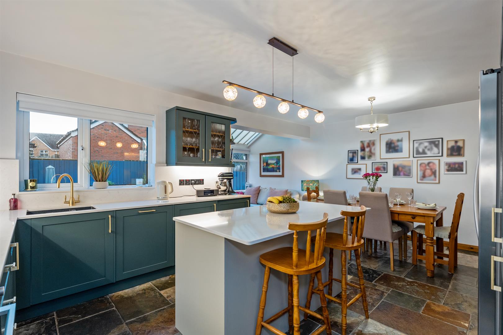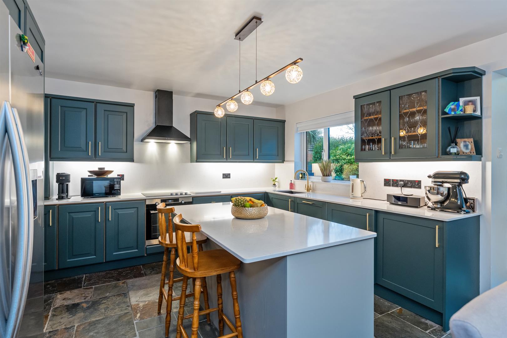 The kitchen and dining area provides a generous and functional space with attractive units, quartz work surfaces, a Caple sink and a full range of integrated appliances including oven, ceramic hob, extractor, dishwasher, washing machine, tumble dryer and space for a fridge freezer. A quartz breakfast bar adds further work and dining space, while Chinese slate flooring continues through to the lean-to conservatory, accessed via an archway.