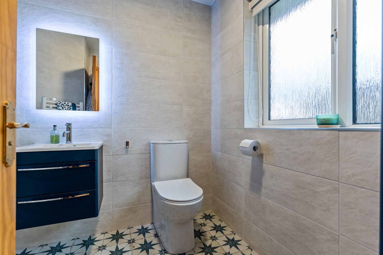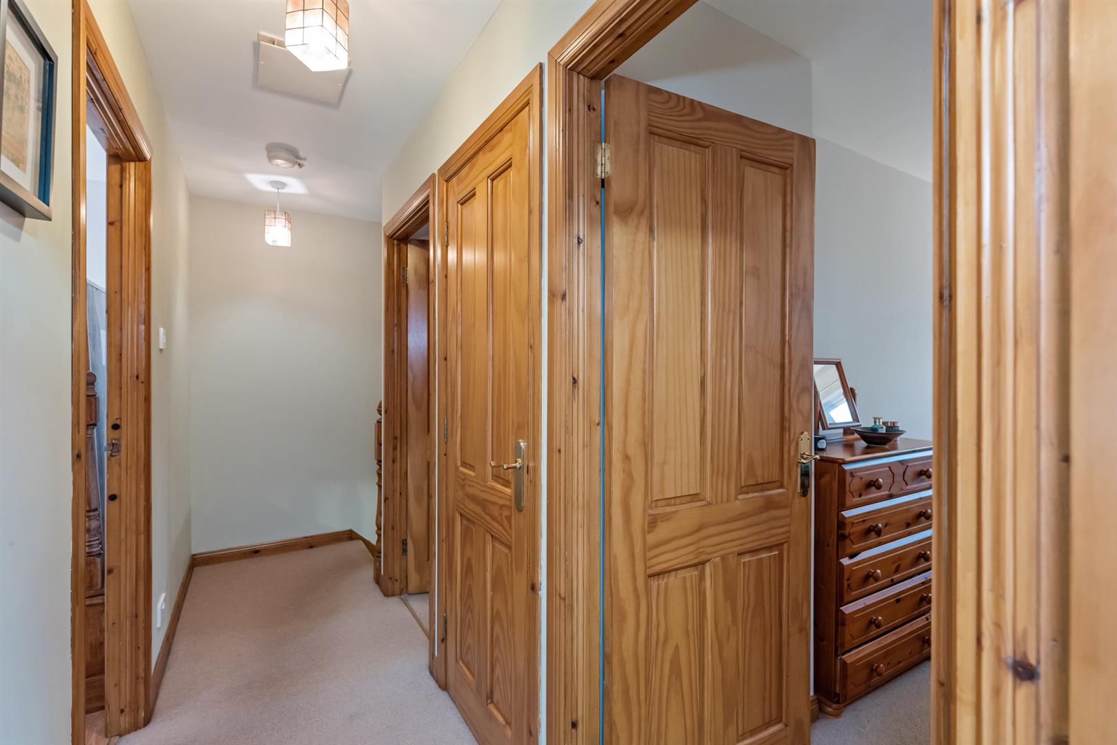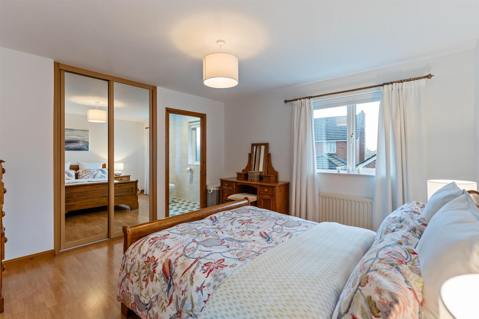 Upstairs, the landing includes a hotpress and leads to three good bedrooms. The main bedroom has sliding mirrored wardrobes and an ensuite with a modern dual-head shower, vanity unit, tiled walls and tiled floor. Bedrooms two and three offer comfortable accommodation, with bedroom three including a built-in cupboard. The family bathroom features a roll-top bath, walk-in shower with electric dual-head system, vanity unit, fully tiled walls and a porcelain tiled floor.