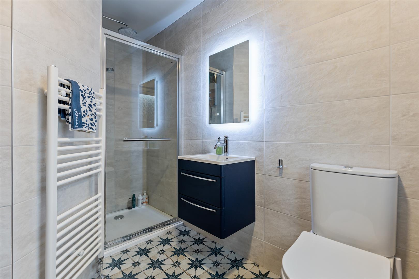 Modern white suite comprising built in shower cubicle with dual showerheads, vanity unit with mixer taps, low flush wc, feature wall mounted radiator, extractor fan, fully tiled walls and tiled floor.