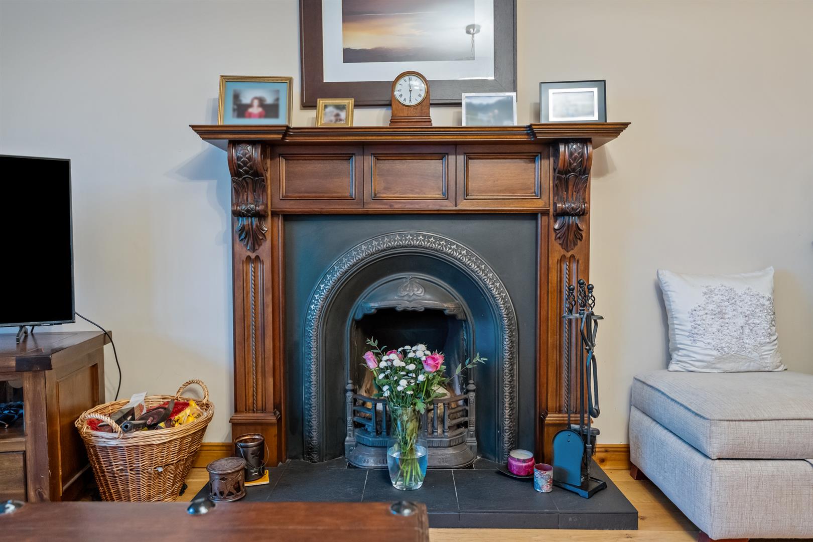 Cast iron fireplace with carved wood surround and tiled hearth. Reclaimed solid Oak flooring.