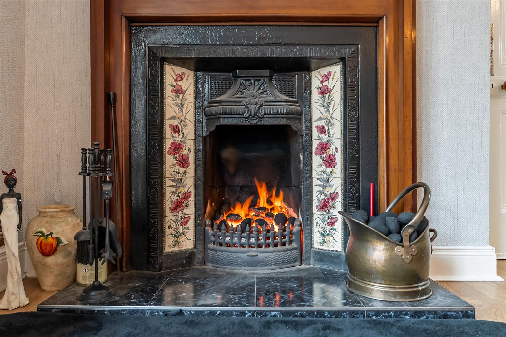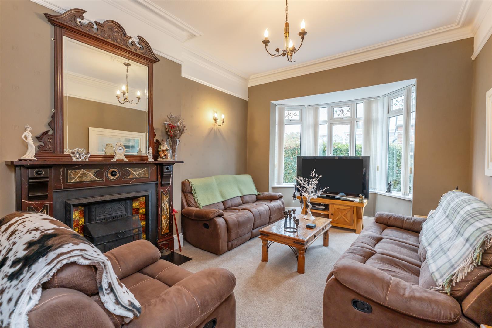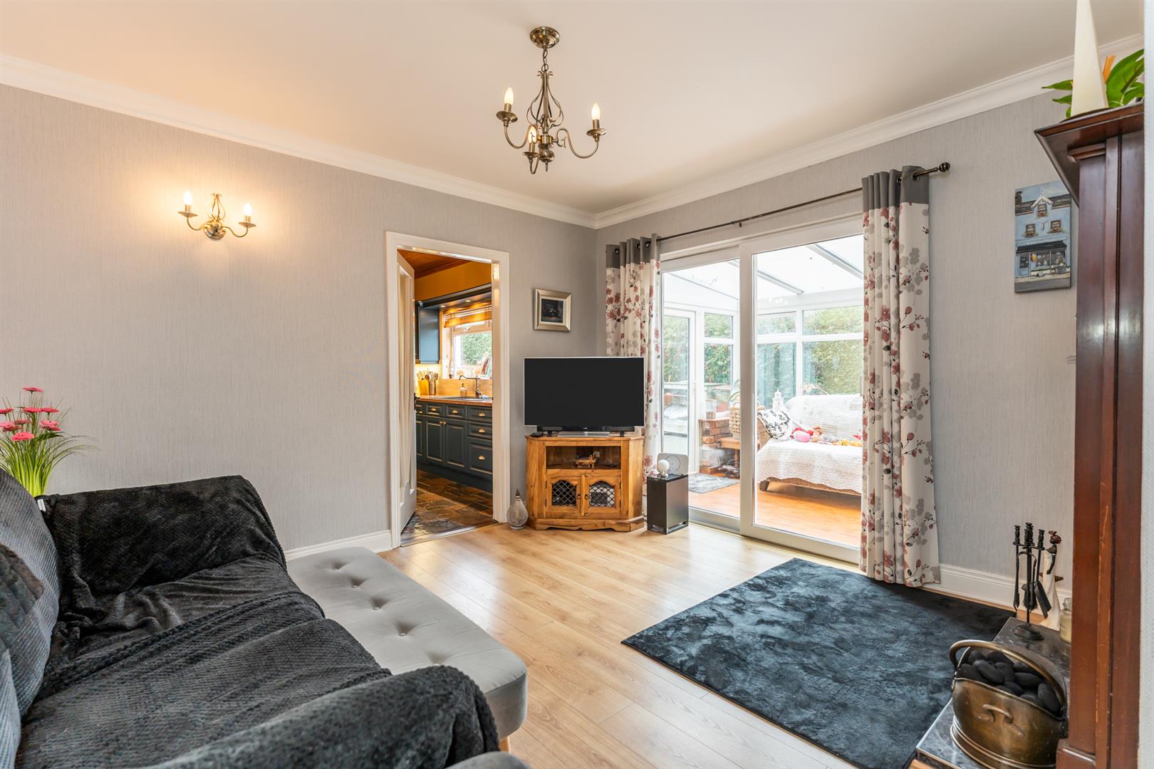 Open fire with marble hearth, carved wooden surround and mantle, tiled inset, corniced ceiling, door to kitchen, sliding doors to conservatory.