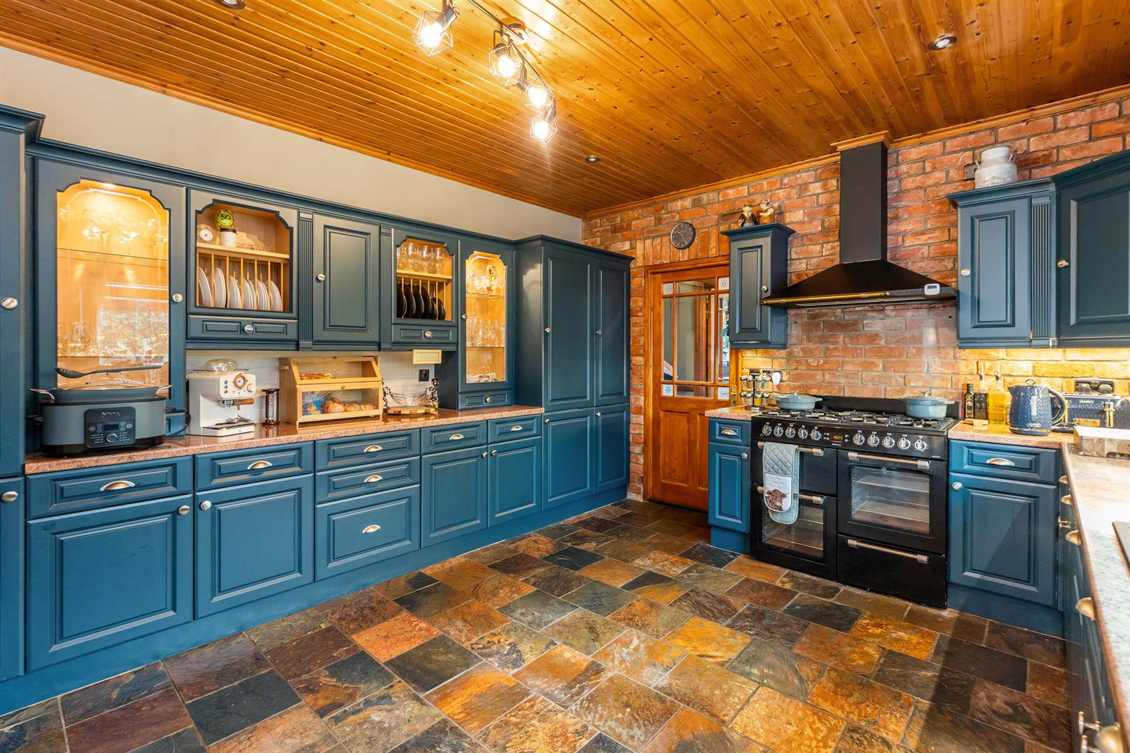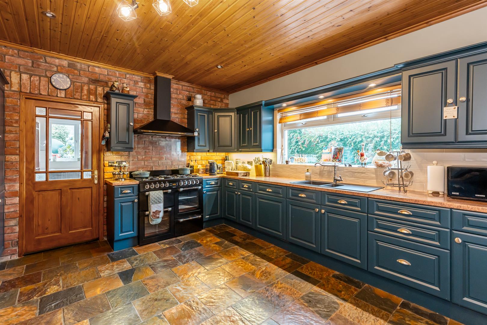Chinese slate flooring, door to side garden, dado rail.