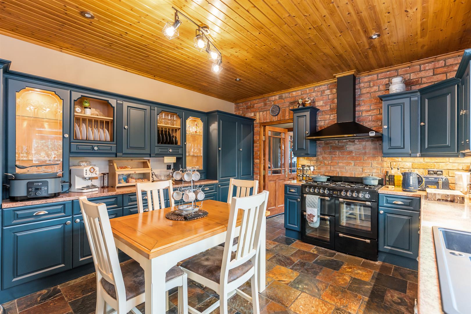 Range of high and low level units, laminate work surfaces, feature glazed units, integrated plate racks, integrated fridge/freezer, space for range cooker, extractor fan and hood, integrated dishwasher, one and a quarter "Franke" sink with mixer tap, recessed spotlighting, Chinese slate flooring, space for dining.
