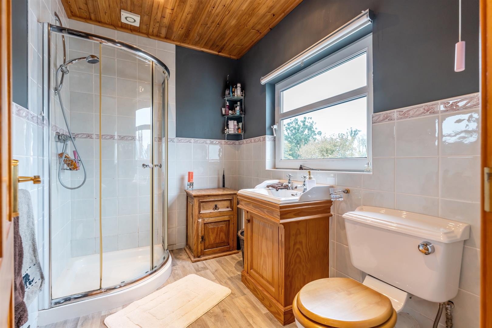 White suite comprising vanity unit with sink and storage, low flush wc, corner shower enclosure with overhead shower and glazed doors, wall mounted radiator, vinyl flooring, part tiled walls, extractor fan, recessed spotlighting.