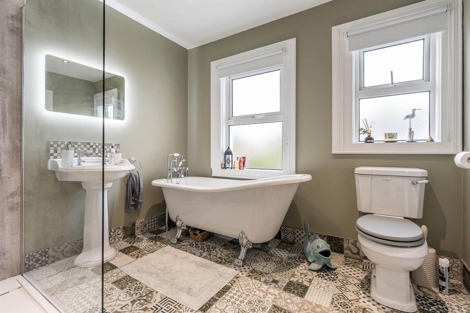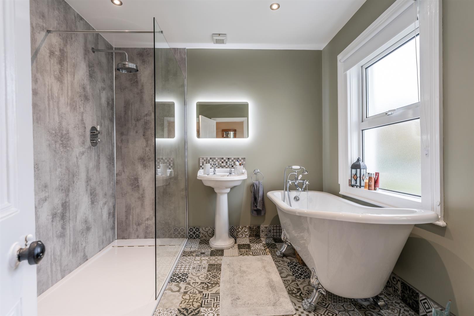 Luxury white suite comprising free standing bath with telephone hand shower set, pedestal wash hand basin, walk in shower enclosure with overhead shower and glazed screen, "Bayswater" low flush wc, wall mounted chrome radiator, tiled flooring, recessed spotlighting, extractor fan.