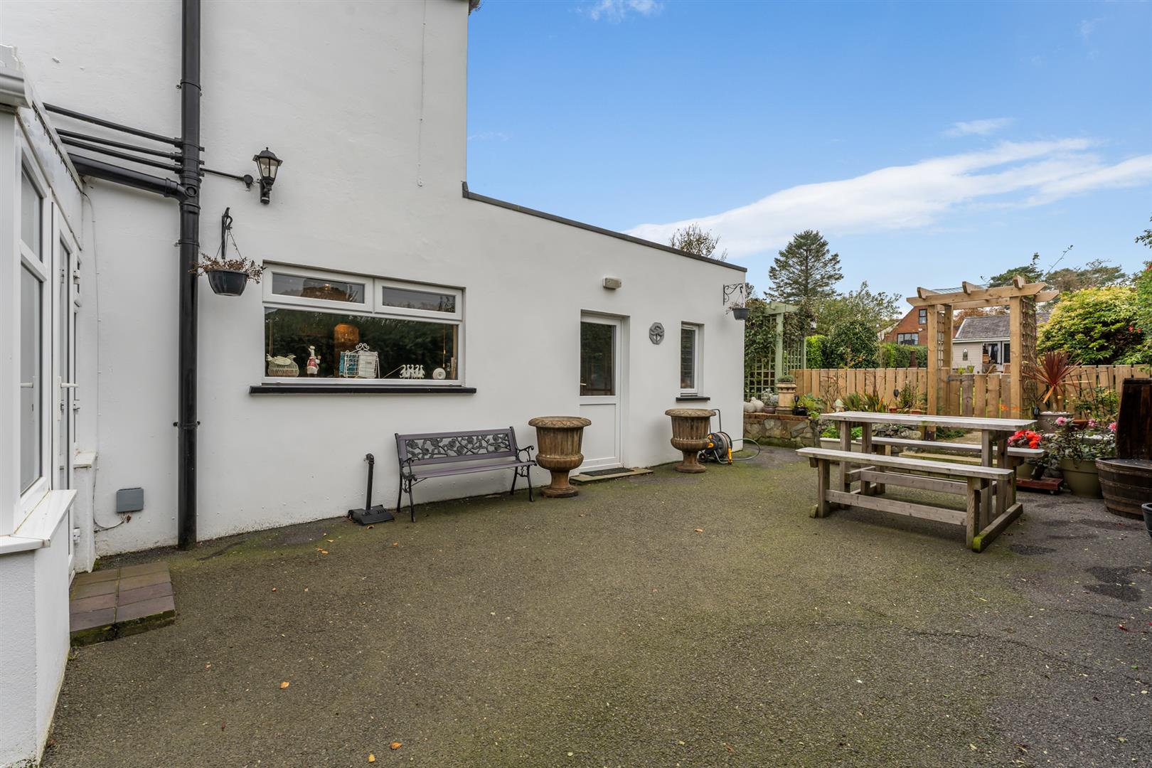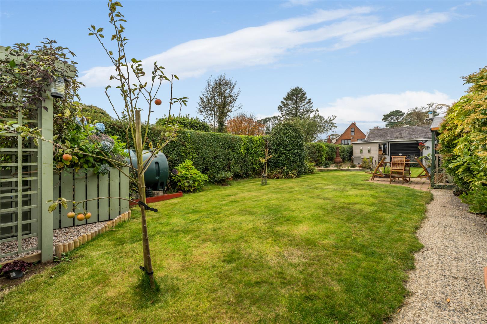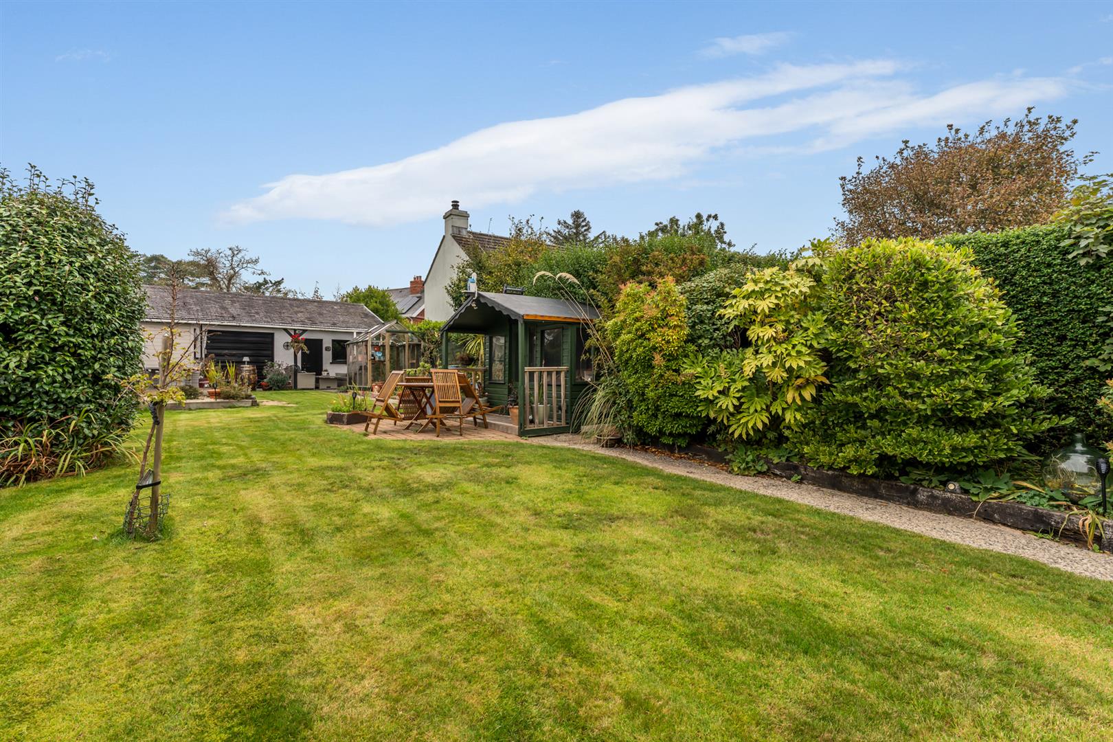 Side and Rear: Enclosed yard, mature plants, shrubs, hedging and trees, raised beds, boiler house with oil fired boiler, fully enclosed rear garden, area in lawn, oil storage tank, paved walkway to summerhouse, paved entertaining area, greenhouse, outside bar area (fully fitted), access to double garage, space for outdoor kitchen, outside tap, outside light.