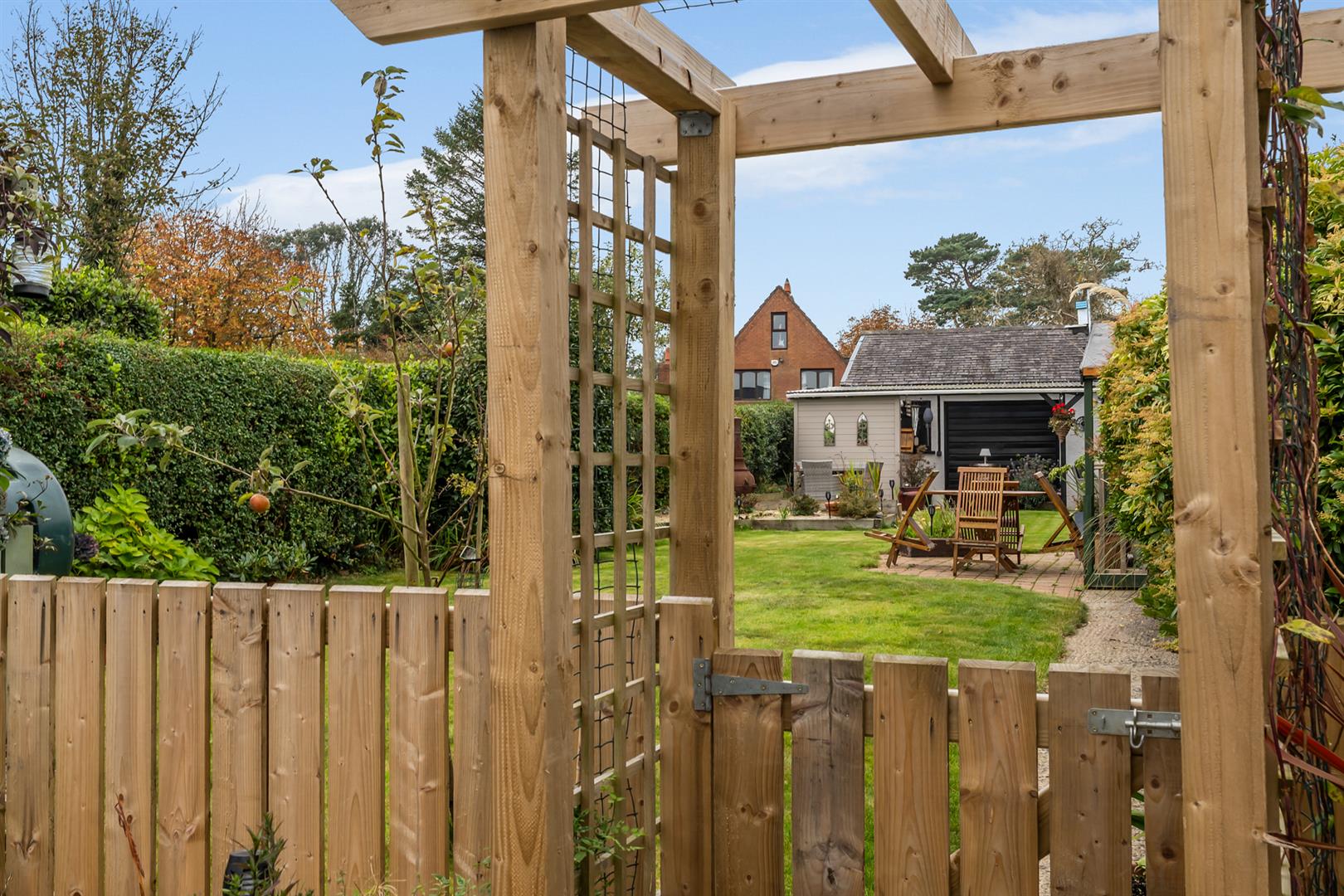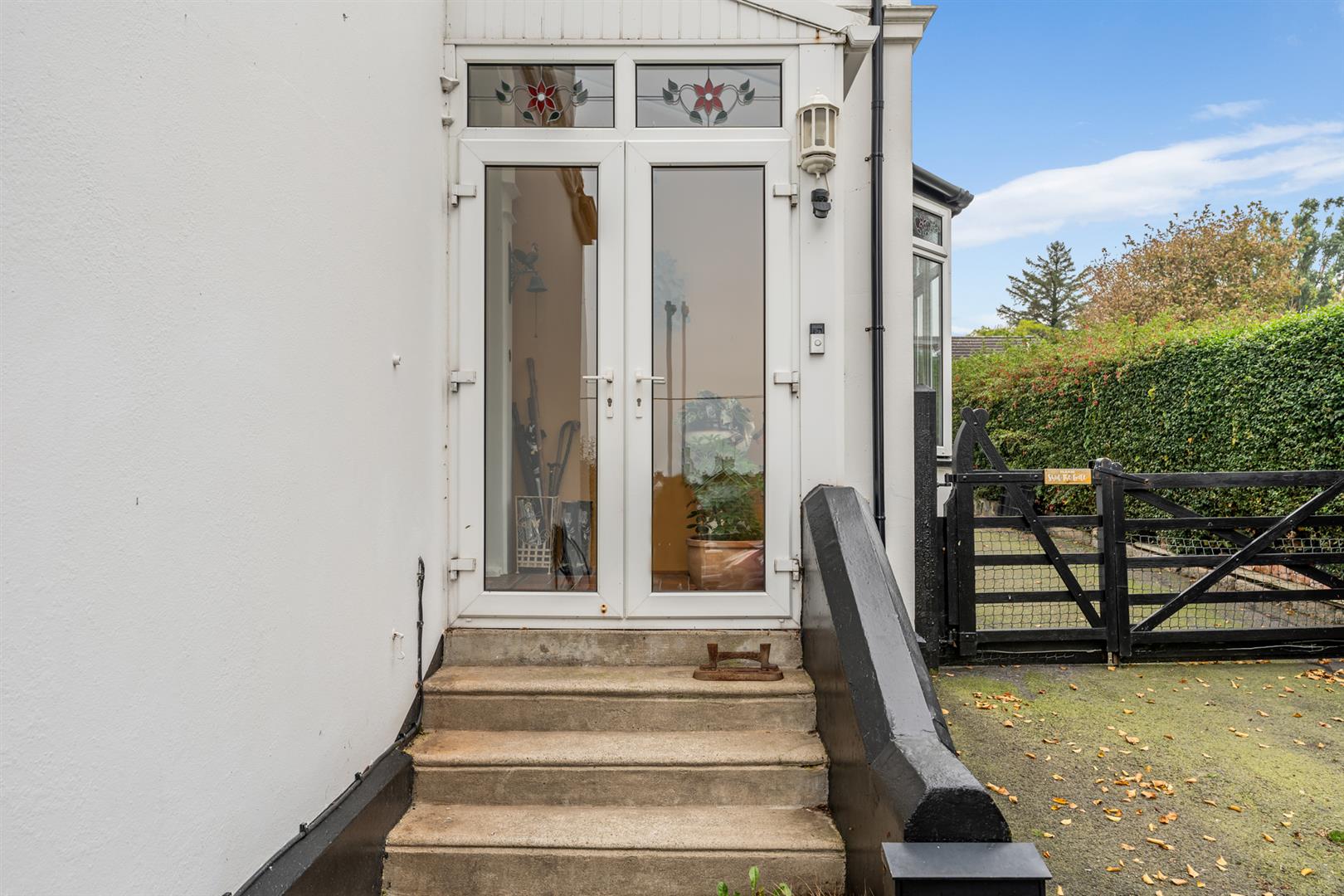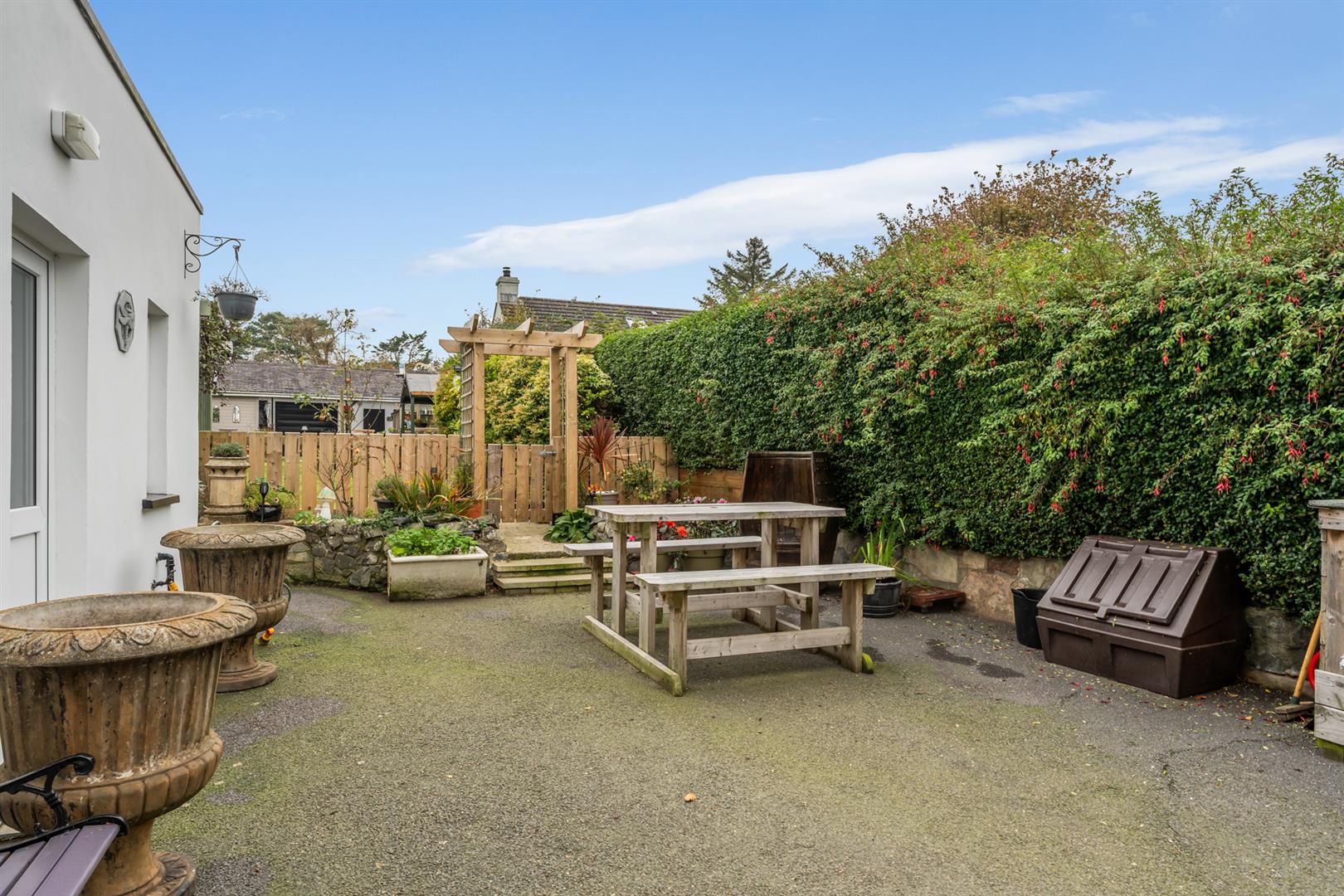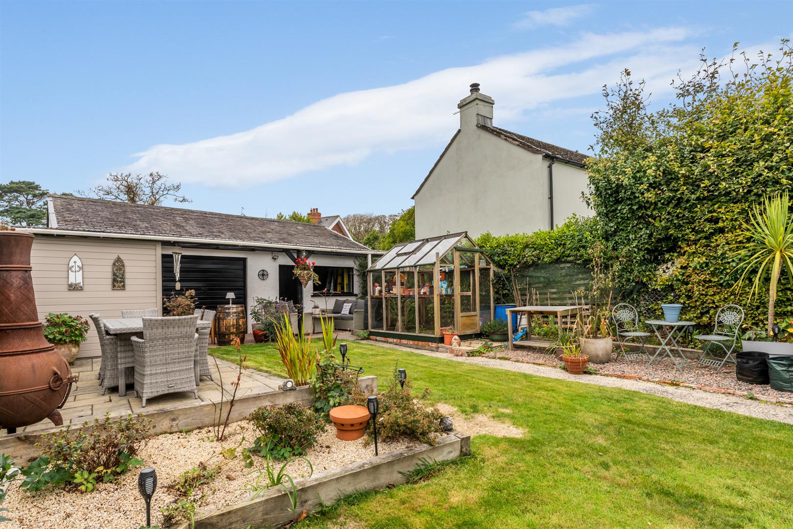 Side and Rear: Enclosed yard, mature plants, shrubs, hedging and trees, raised beds, boiler house with oil fired boiler, fully enclosed rear garden, area in lawn, oil storage tank, paved walkway to summerhouse, paved entertaining area, greenhouse, outside bar area (fully fitted), access to double garage, space for outdoor kitchen, outside tap, outside light.