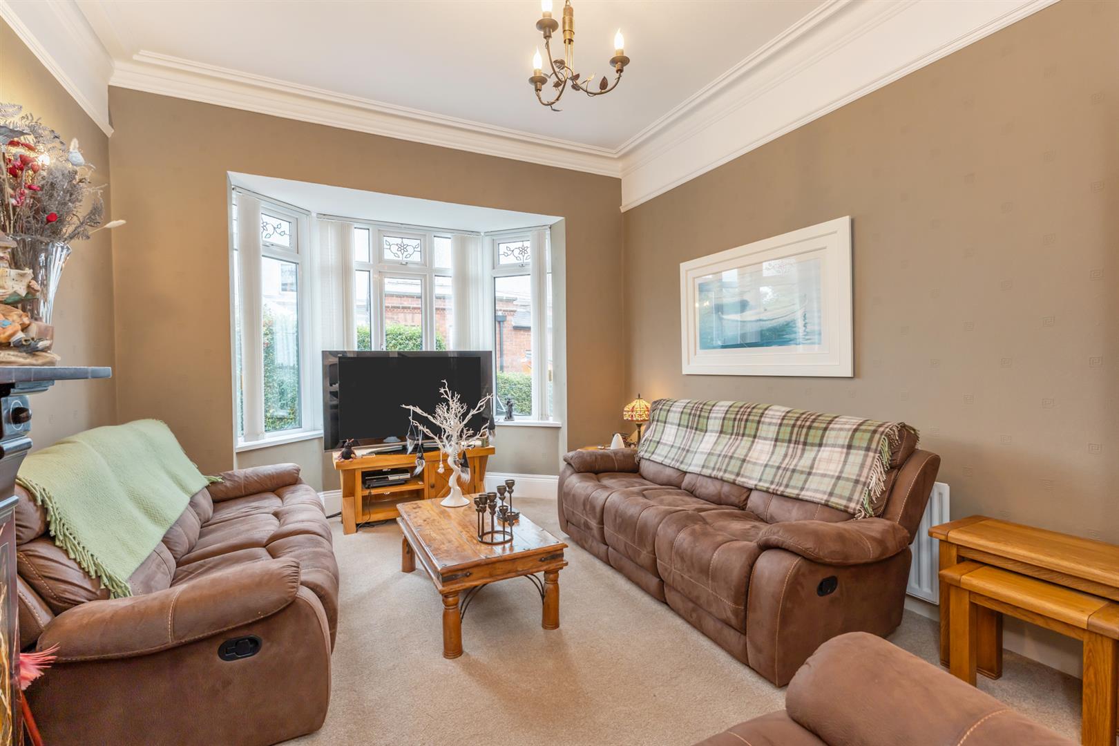 Side bay window, gas fire with slate hearth, marble surround and cast iron and tiled inset, picture rail, corniced ceiling, ceiling rose.