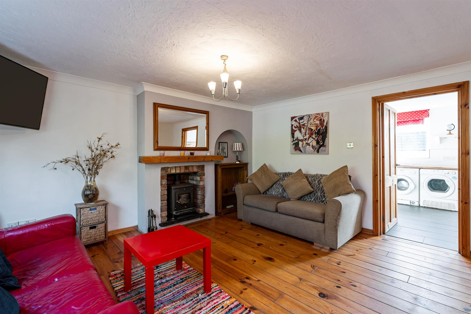 The property comprises a comfortable lounge with a wood-burning stove, a spacious modern kitchen with dining area and integrated appliances, three bedrooms, and a contemporary bathroom suite.