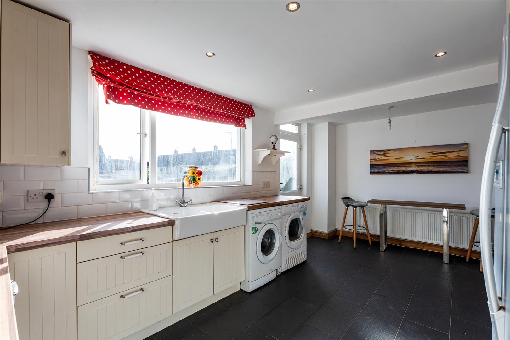 Fitted kitchen with range of high & low level units, laminate effect work surface, inset double ceramic sink with mixer tap, plumbed for washing machine & tumble dryer, plumbed for American style fridge/freezer, integrated oven, four ring gas hob, black extractor hood, tiled flooring, part tiled walls, recessed lights, space for dining, back door to enclosed rear garden, storage under the stairs.