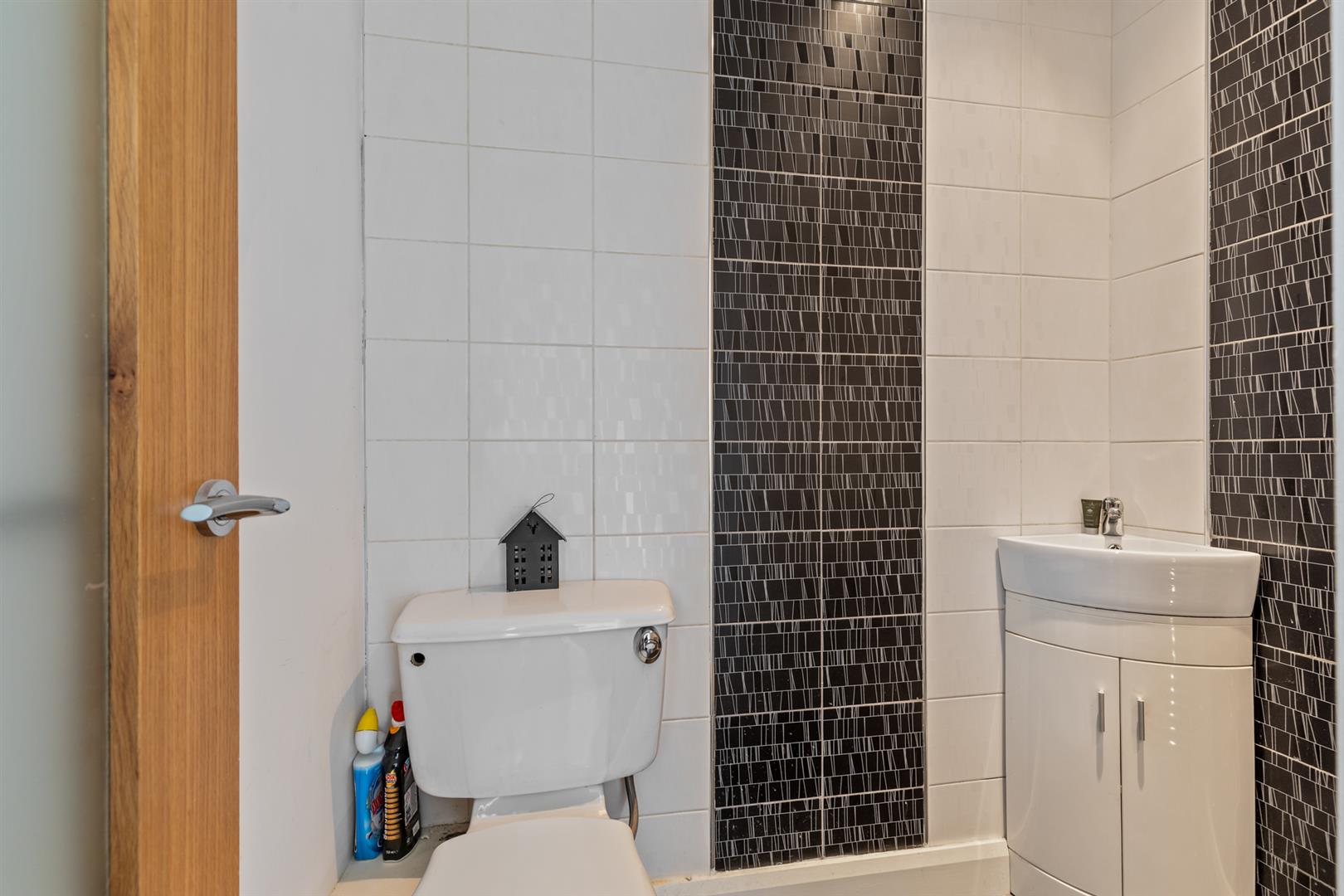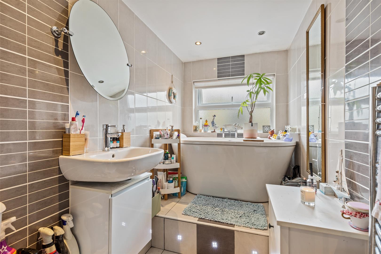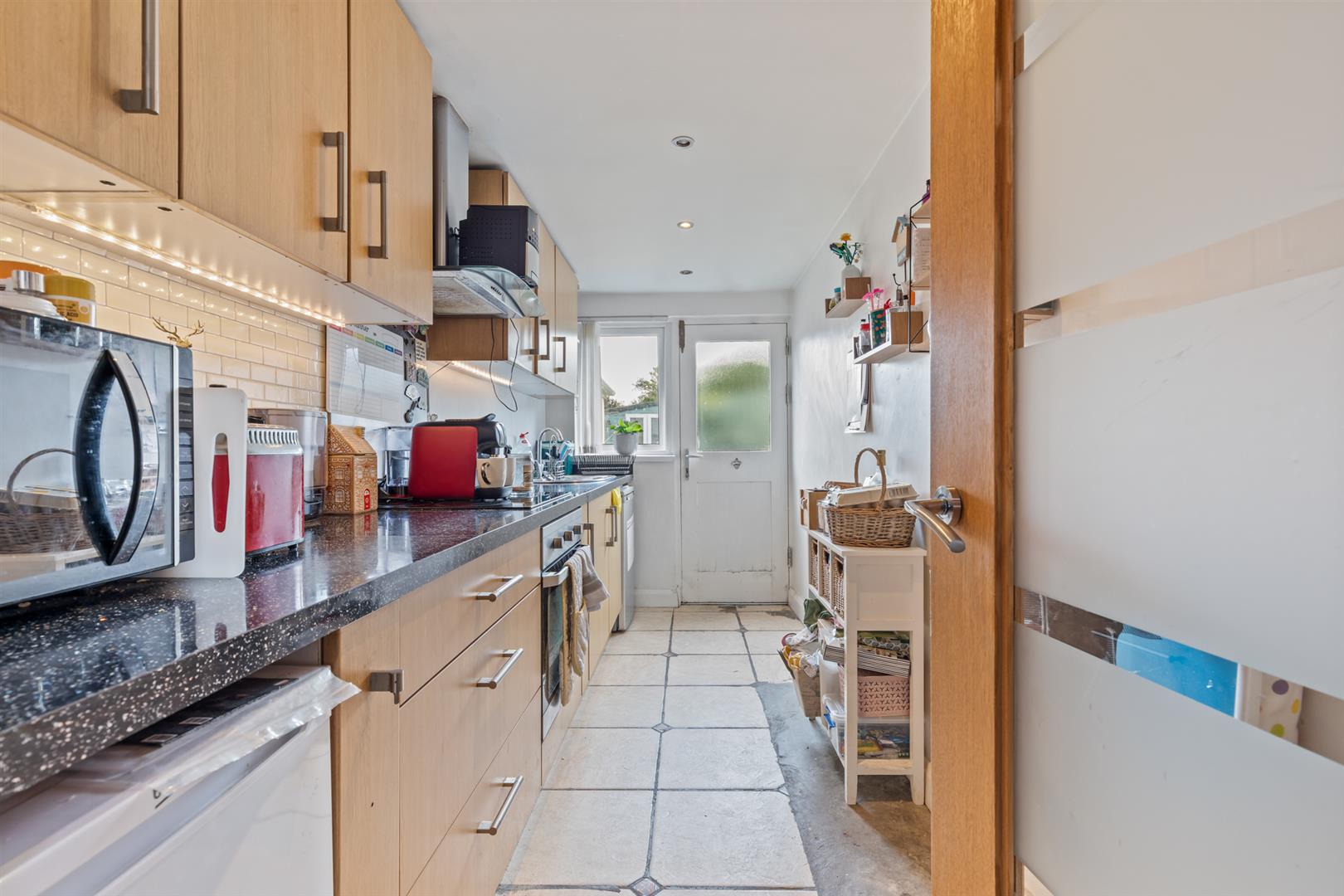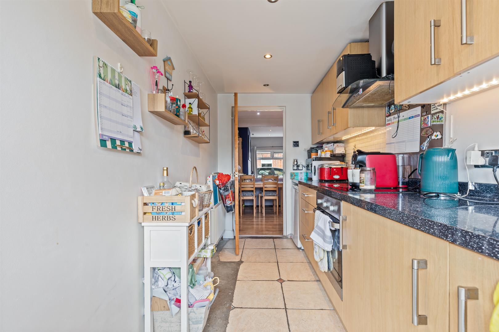 Galley style fitted kitchen and downstairs family bathroom comprising of four piece white suite
