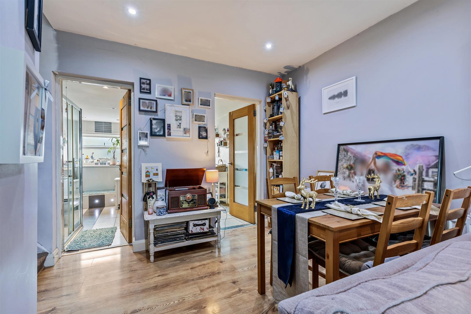 Wood laminate flooring, log burning stove with tiled hearth, space for dining.