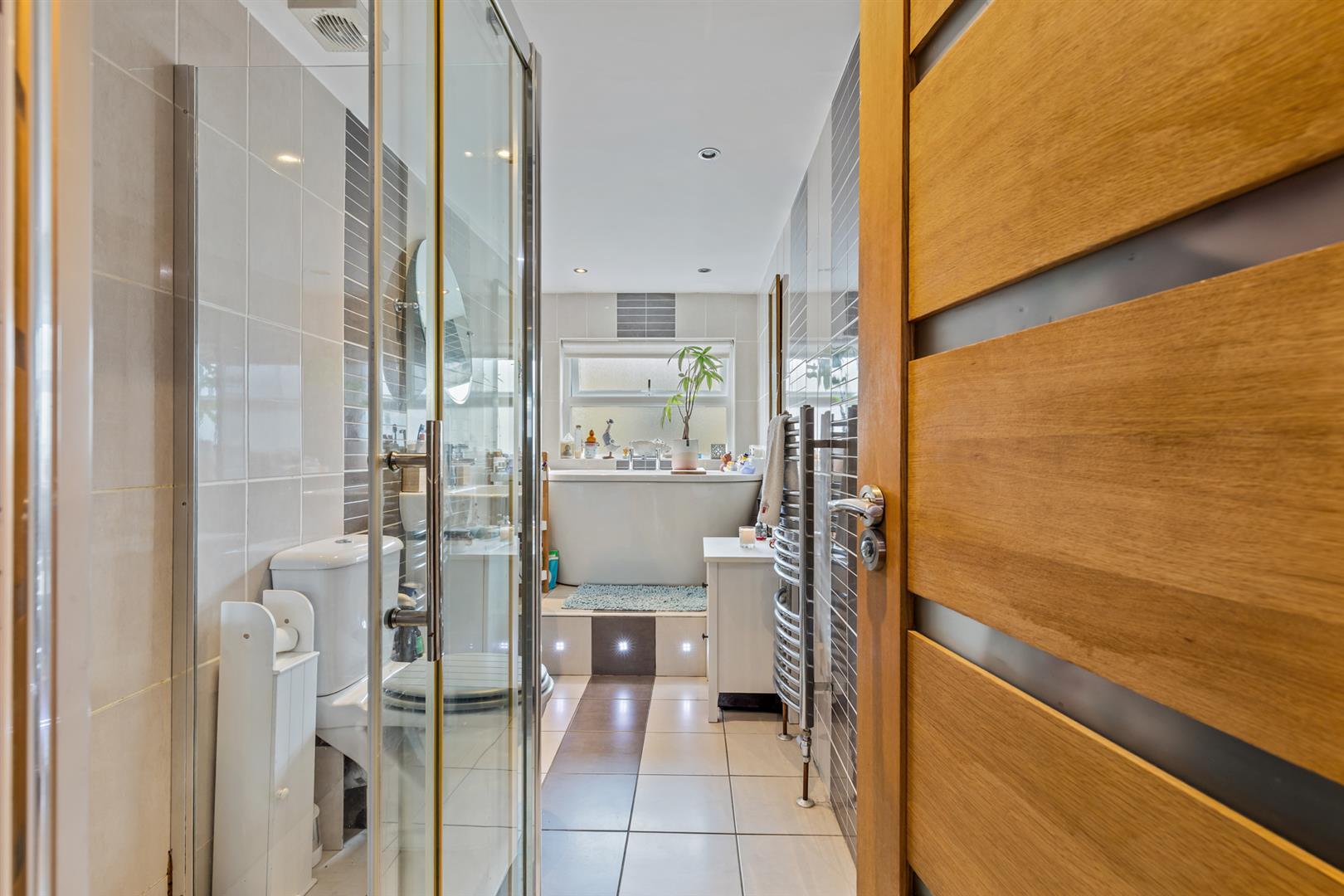 White suite comprising, free standing bath with mixer tap, vanity unit with mixer tap and storage, low flush w/c, corner shower enclosure, wall mounted overhead shower, glass door, tiled floor, tiled walls, recessed spotlights, extractor fan.
