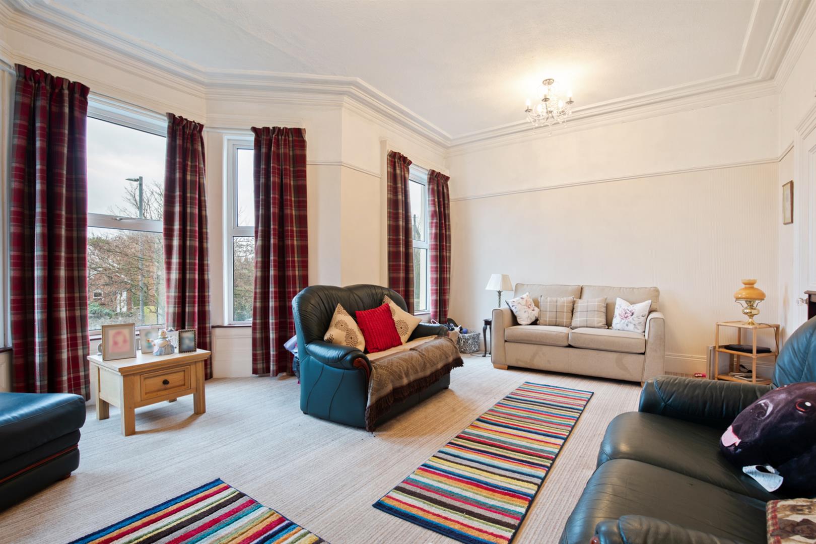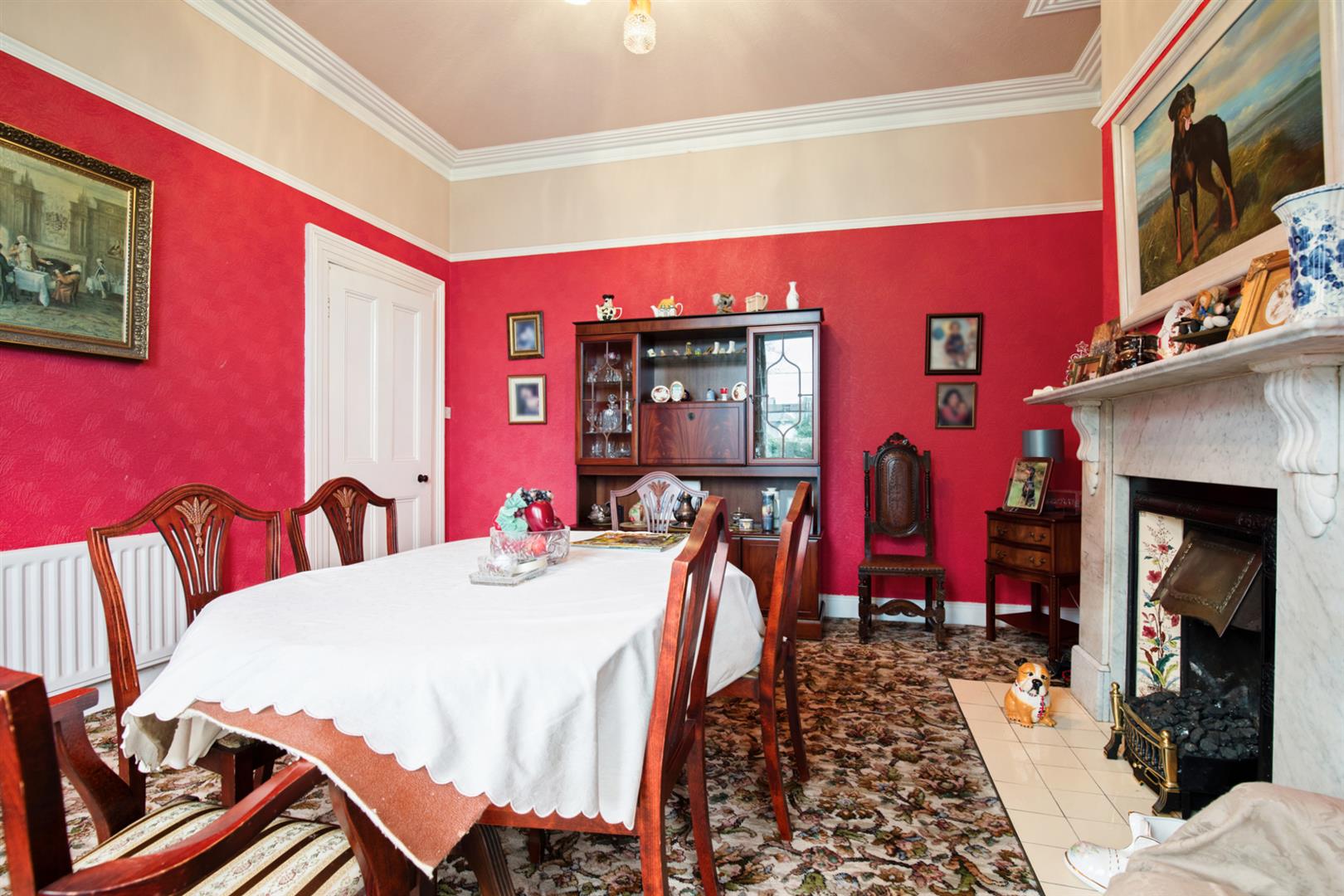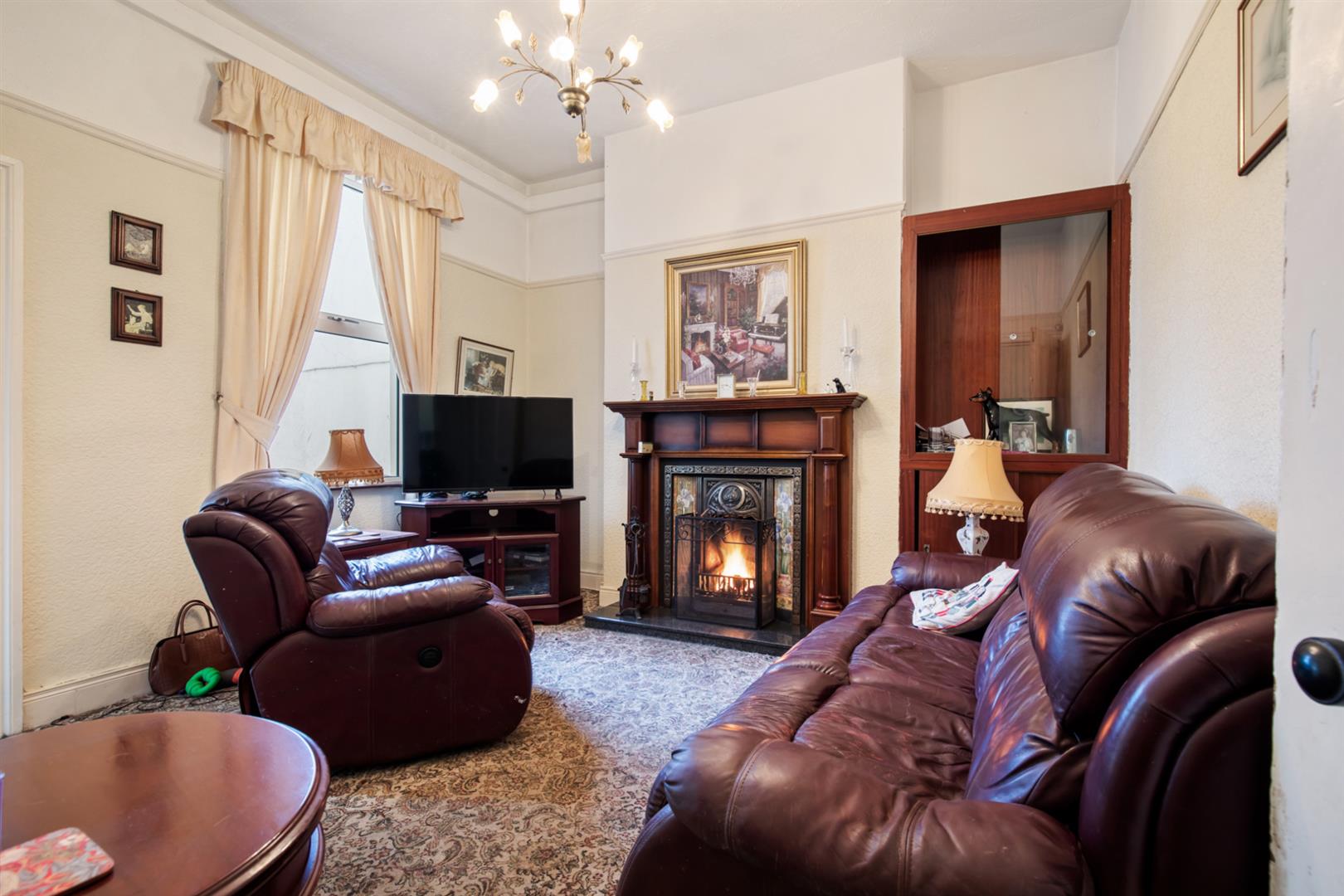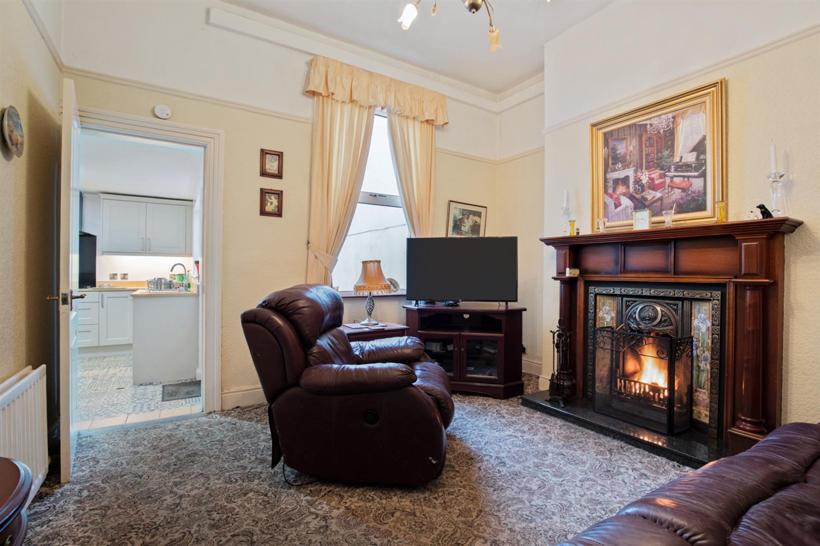 Bay window, corniced ceiling, picture rail, open fire with tiled hearth, decorative tiled inset and granite surround and mantle.