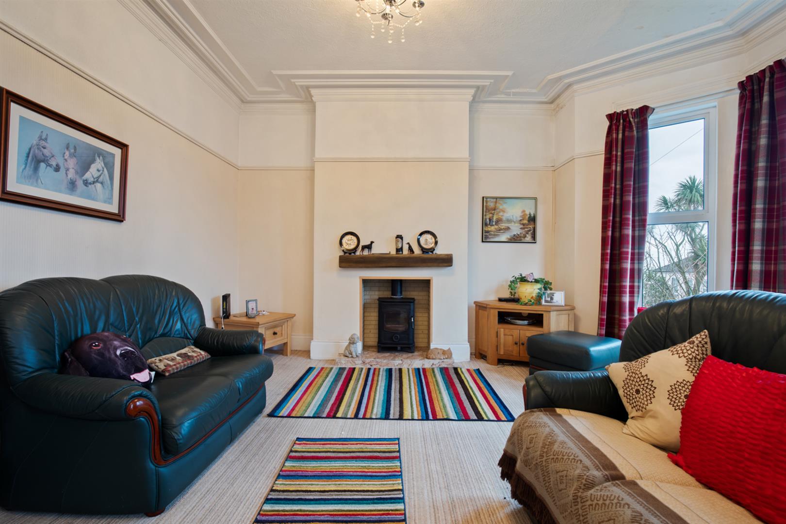 Sea views, bay window, Inglenook style fireplace with marble hearth, brick inset, stove and wooden beam mantle, picture rail, corniced ceiling.