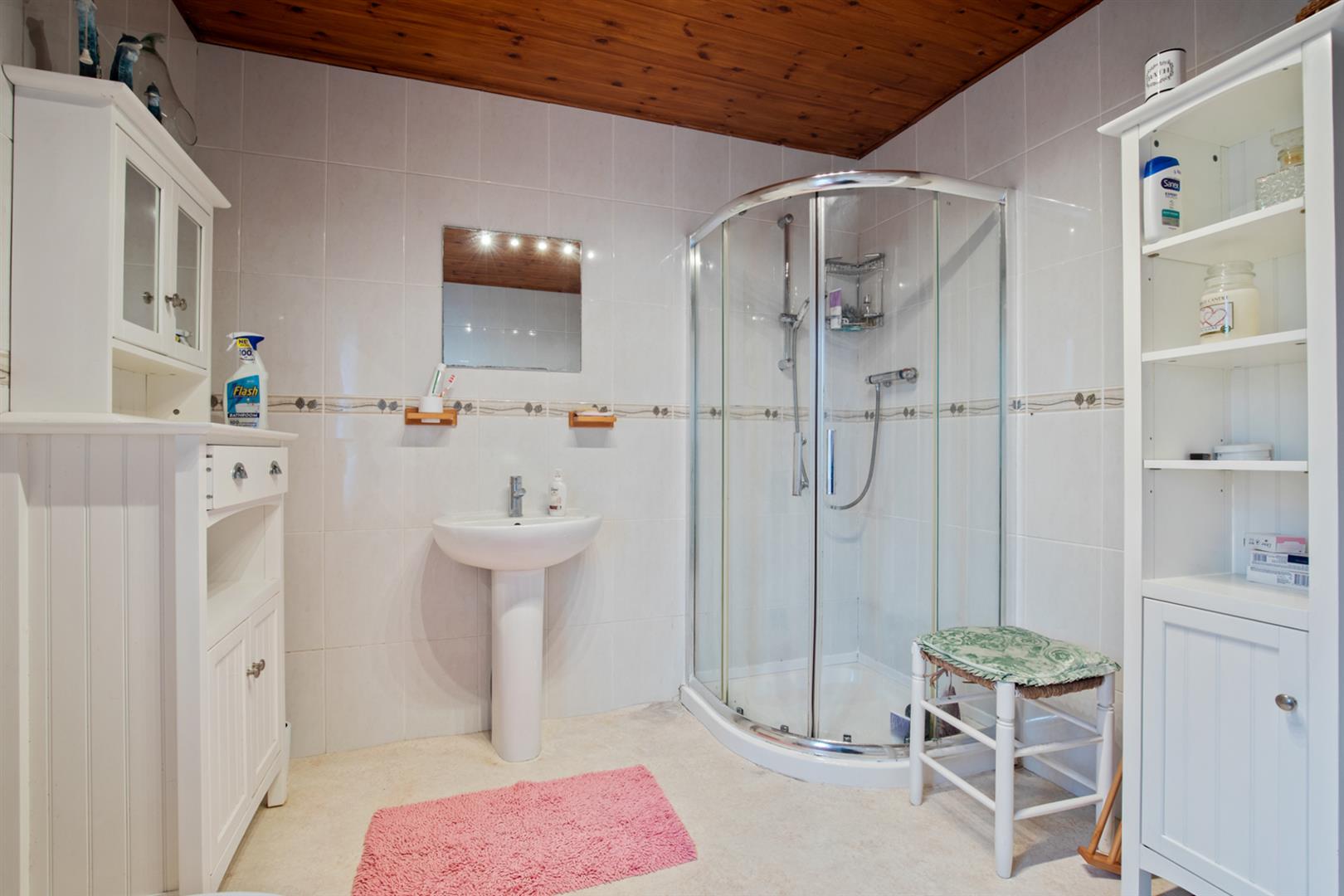 White suite comprising corner shower enclosure with overhead shower and glazed doors, pedestal wash hand basin with mixer tap, low flush wc, tiled walls, vinyl flooring, hot press with storage.