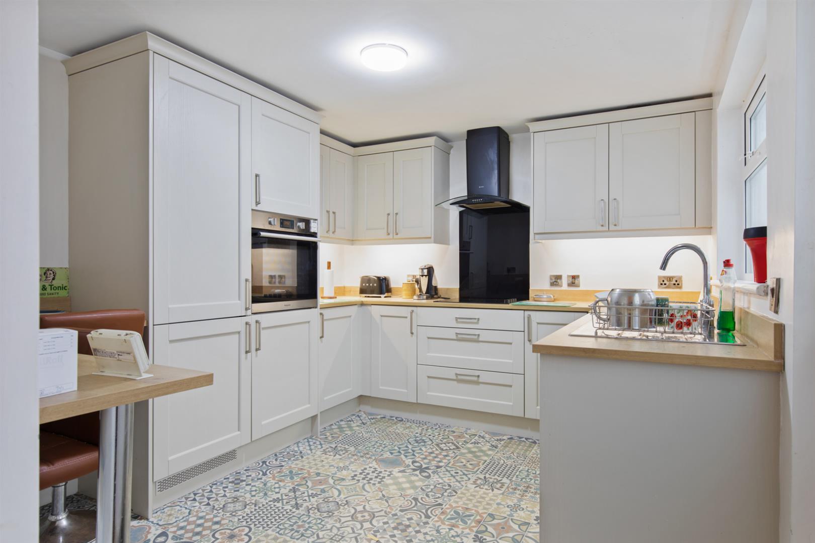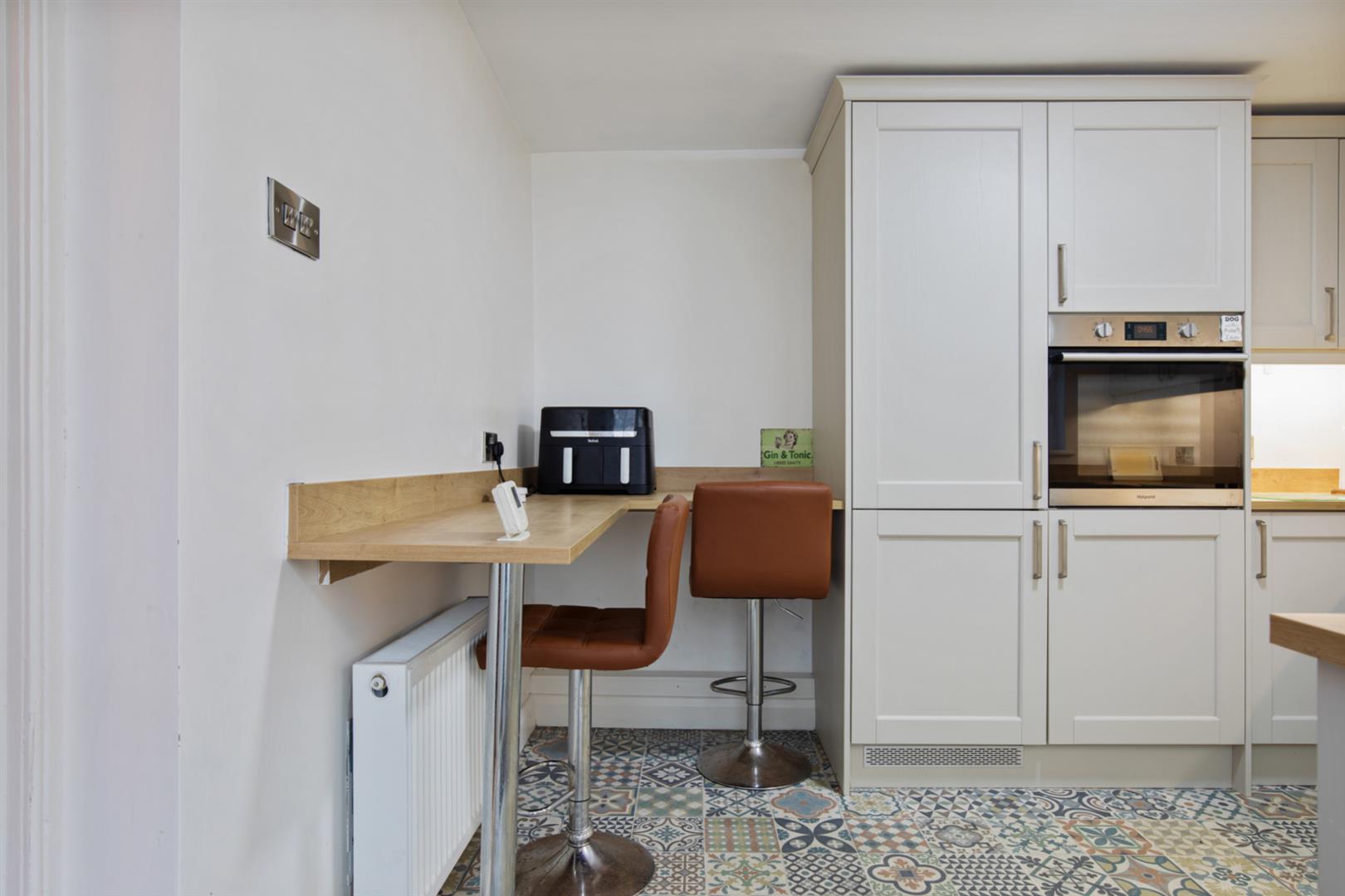 Modern range of high and low level units, wood effect work surfaces and upstands, breakfast bar area, integrated "Hotpoint" oven, integrated 4 ring hob with extractor fan and hood, single stainless steel sink with mixer tap and built in drainer, integrated dishwasher, tiled flooring, door to rear courtyard.