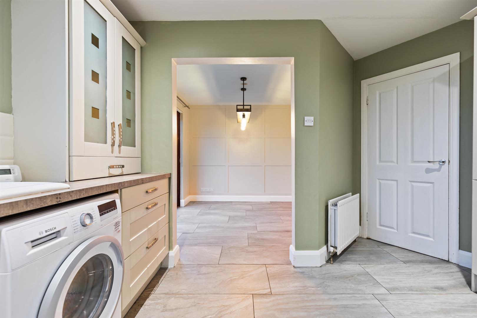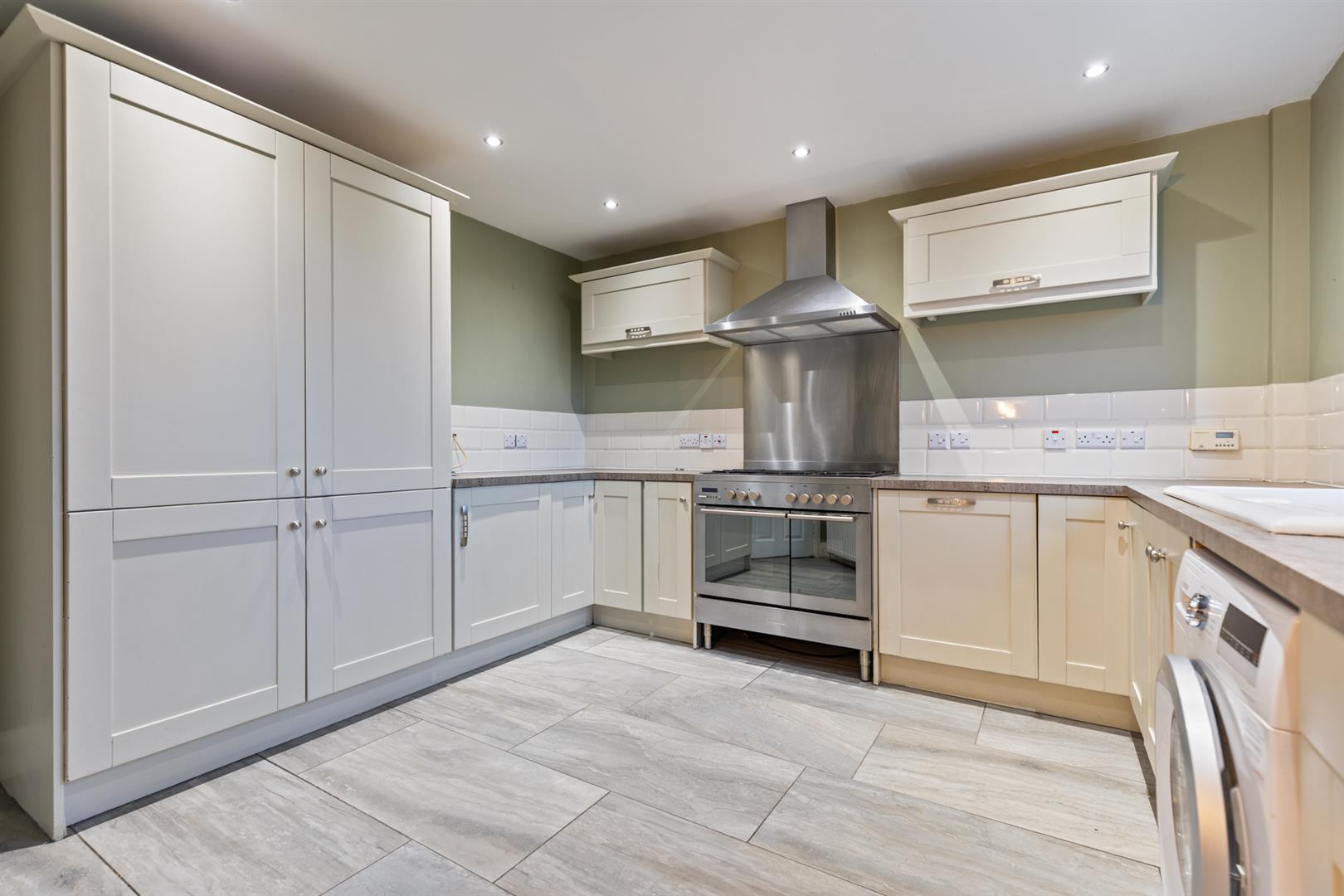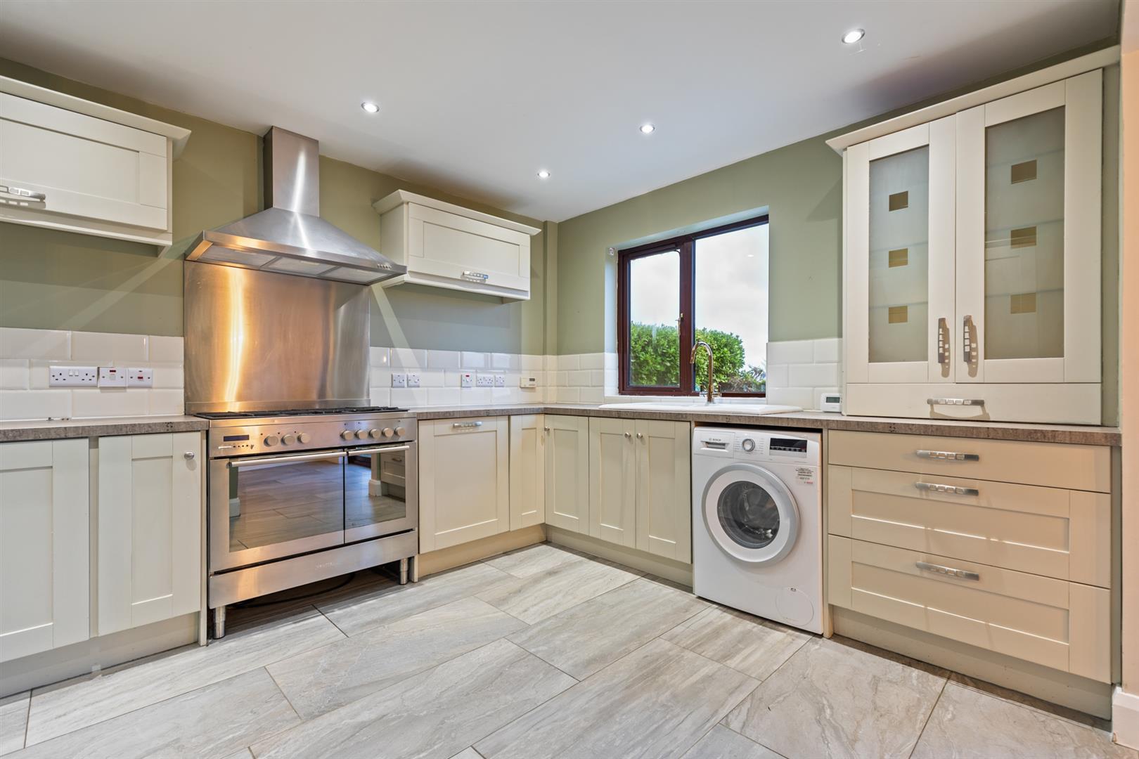 Modern fitted kitchen, range of high and low level units, laminate work surfaces, one and a quarter ceramic style sink with mixer tap and drainer, space for range cooker, stainless steel extractor hood, plumbed for washing machine, integrated dishwasher, under counter fridge, larder cupboard, tiled floor, part tiled walls and recessed spotlights. Leading through to dining room.