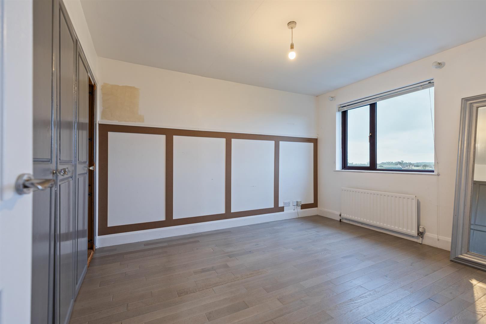 Double bedroom with wood laminate flooring, built in storage and rural views over surrounding fields.