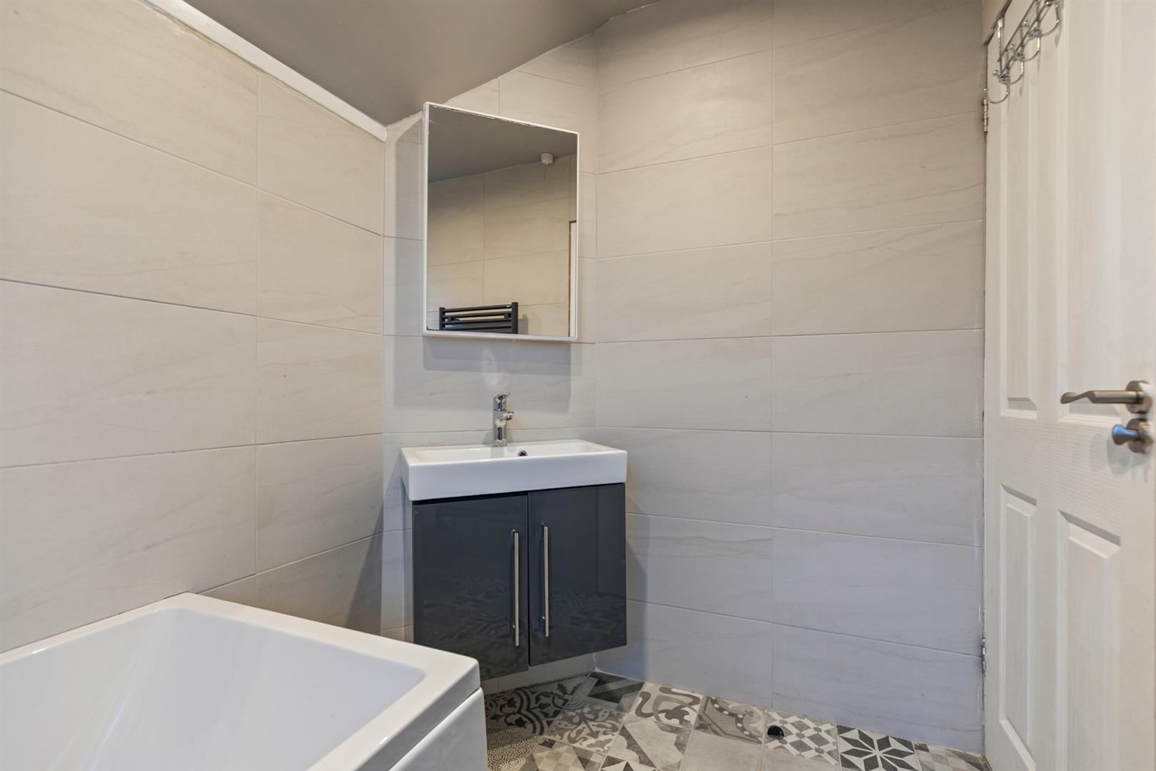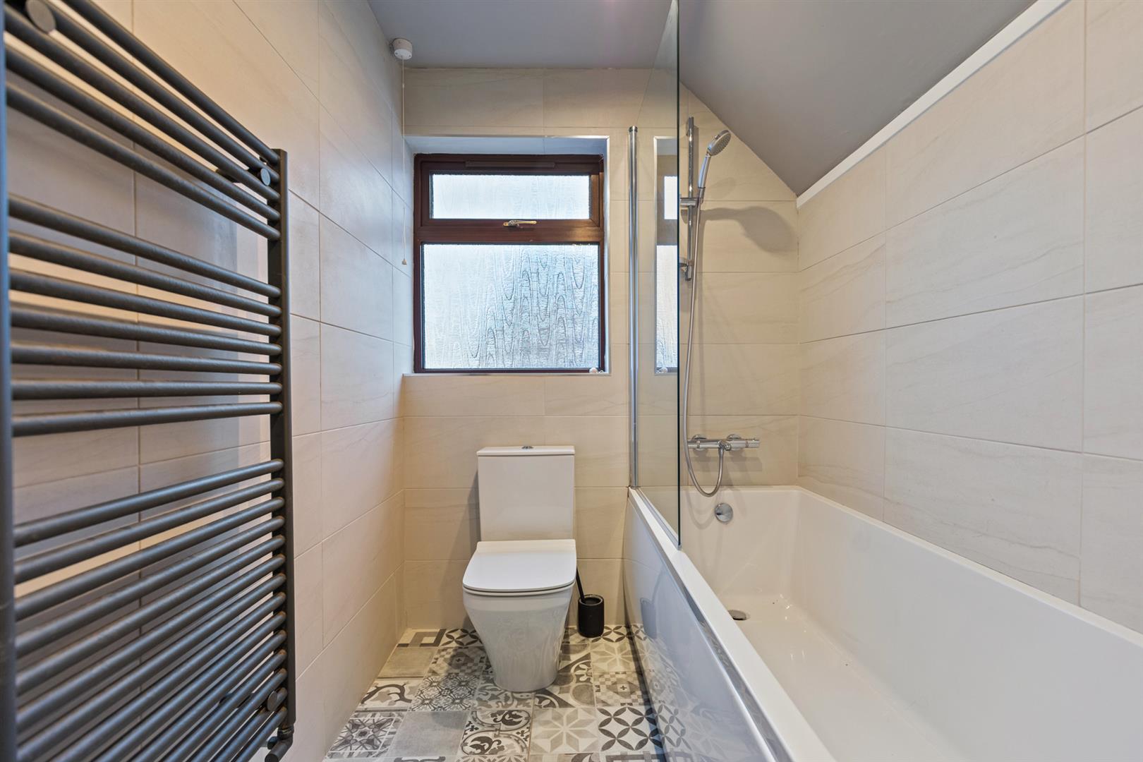 White suite comprising panelled bath with mixer tap and shower attachment, glass shower screen, vanity unit with mixer tap and storage, low flush w/c, tiled floor, tiled walls, heated towel rail, recessed spotlights and extractor fan.