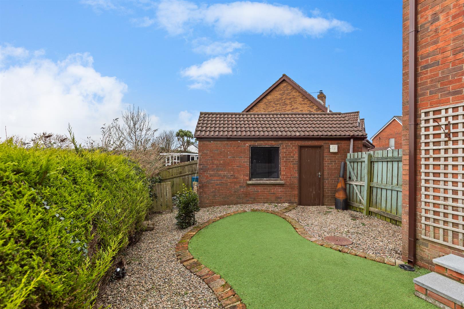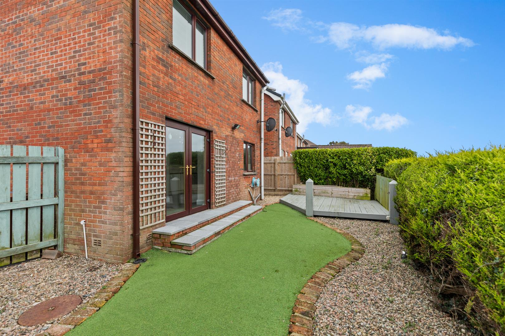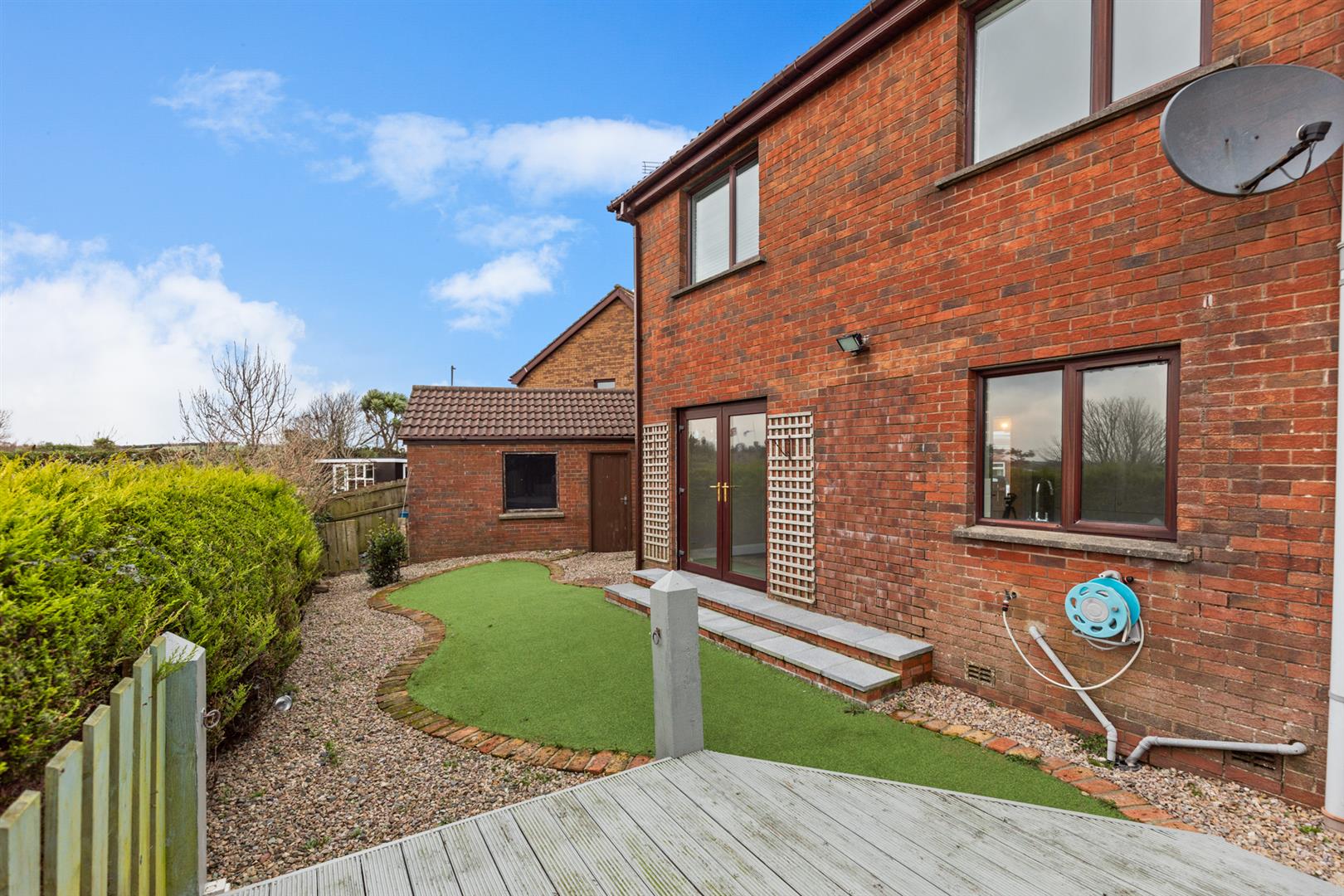 Enclosed rear garden with artificial lawn, stone areas and decking
