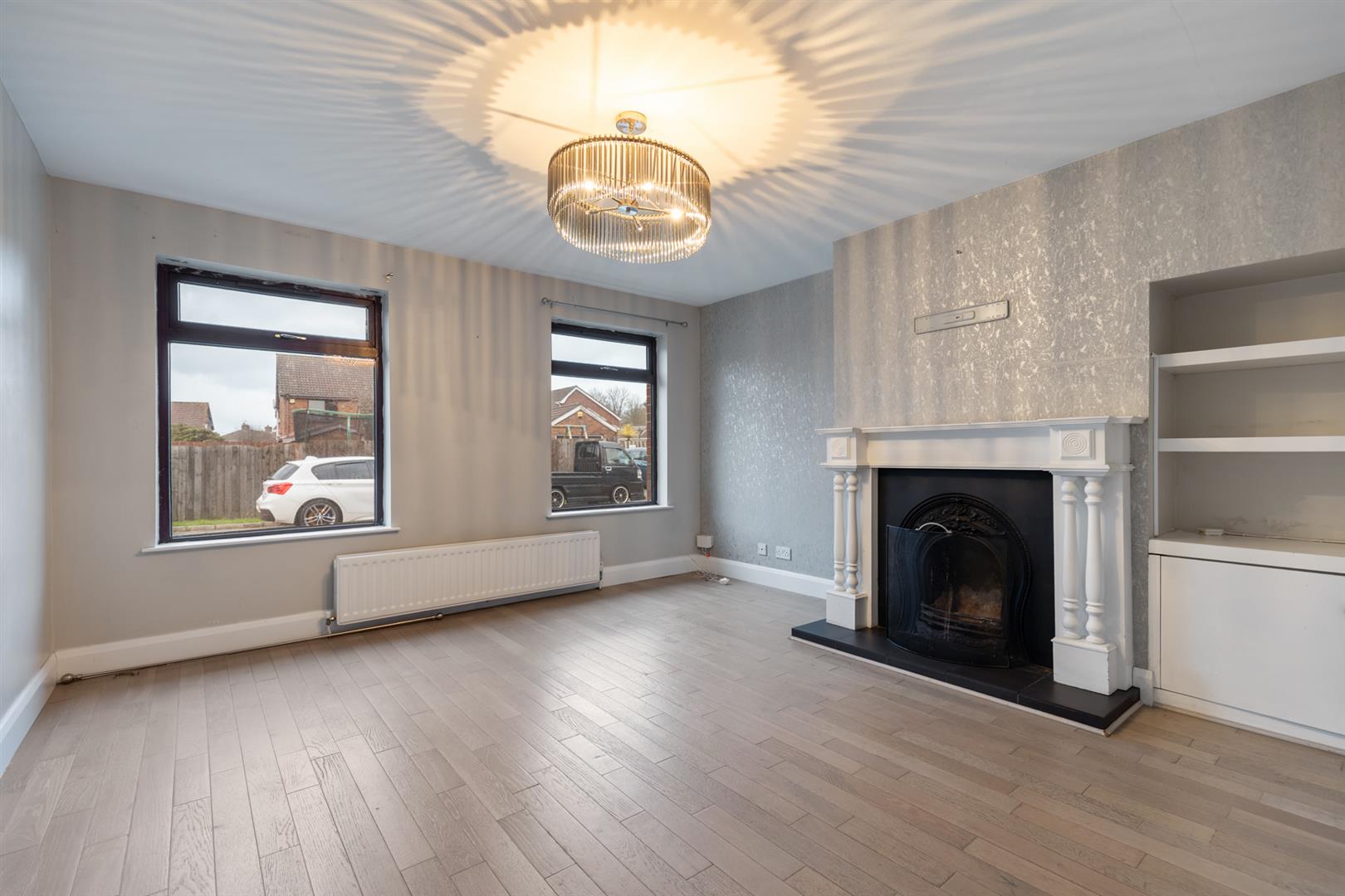 Bright living room with open fireplace and built-in storage
