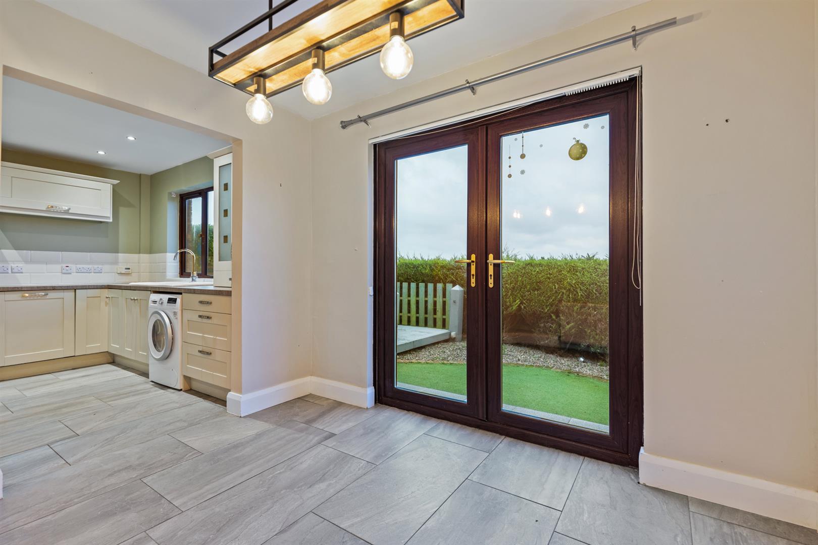 The accommodation is thoughtfully laid out and begins with a welcoming entrance hall featuring a tiled floor and useful under-stair storage. The living room is a bright and inviting space with wood laminate flooring, an open fireplace with tiled hearth, iron surround and wooden mantle, complemented by built-in storage and shelving. The modern fitted kitchen is well equipped with mixture of integrated and free standing appliances. The dining area features a tiled floor and double patio doors opening directly onto the enclosed rear garden, ideal for everyday living and entertaining.