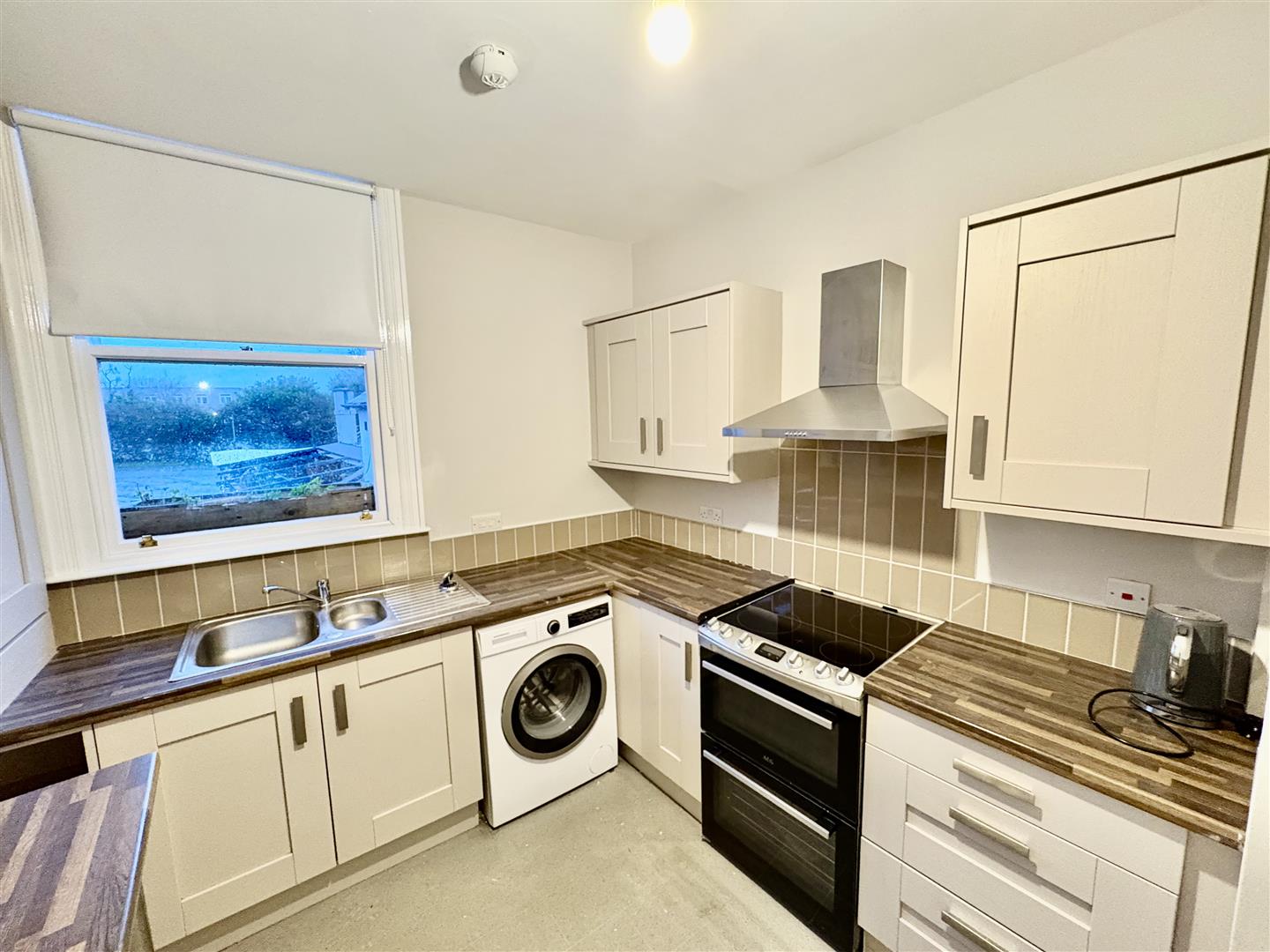 Accessed via a porch with tiled flooring, the apartment opens into an entrance hall with wood laminate flooring. An additional office or cloakroom provides excellent versatility, ideal for home working or storage. The generous living room offers ample space for both relaxing and dining, while the fitted kitchen features a range of high and low level units with laminate work surfaces, breakfast bar, partially tiled walls and integrated appliances including cooker, extractor hood, washing machine and fridge/freezer. The gas fired boiler is neatly enclosed.