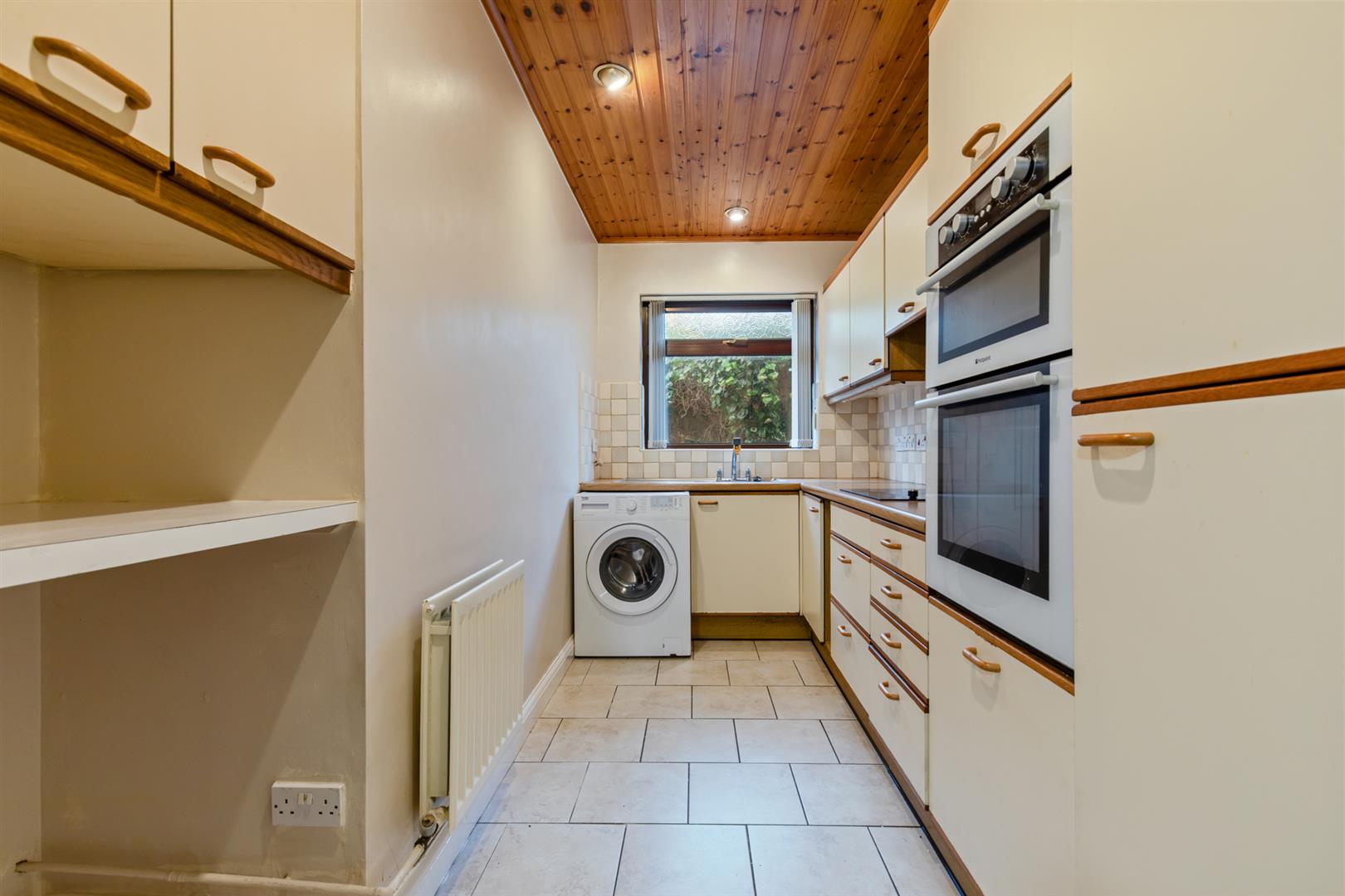Galley style kitchen, range of high and low level units, laminated work surfaces, single stainless steel sink with mixer tap and drainer, partially tiled walls, plumbed for washing machine, four ring electric hob, integrated grill and oven, integrated extractor fan, larder cupboard, space for fridge, tiled floor.