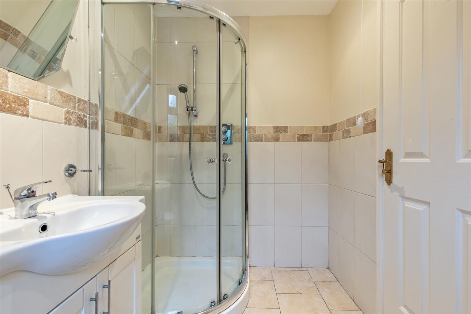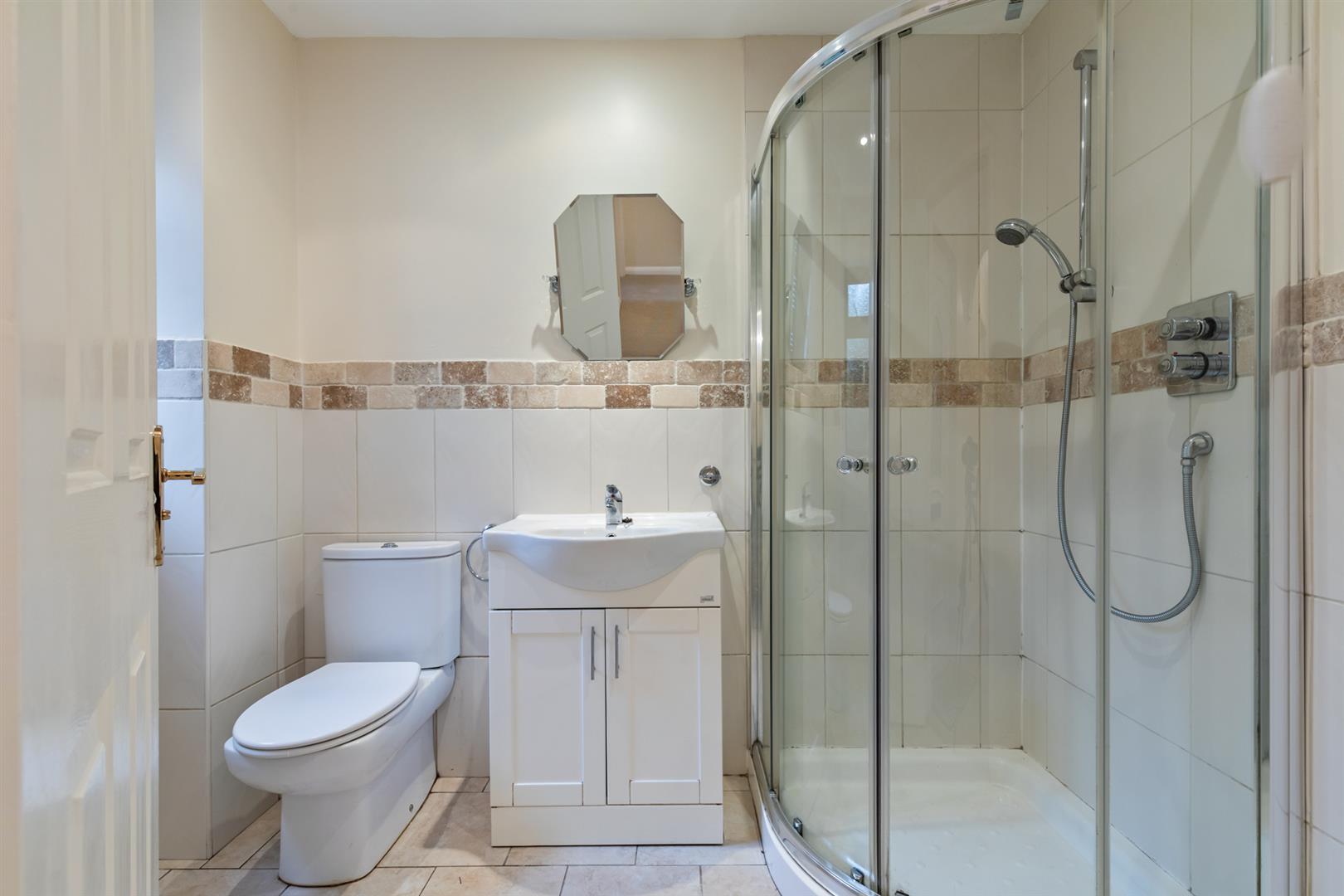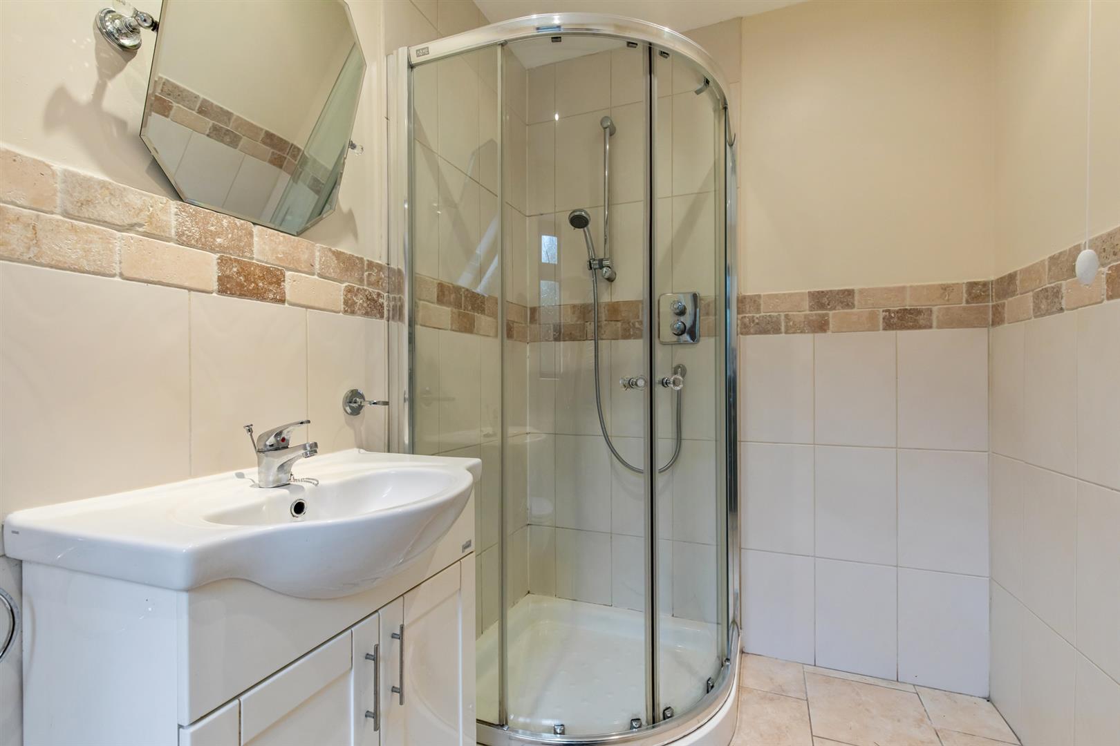 White suite comprising, corner shower enclosure, wall mounted overhead shower, sliding glass doors, low flush w/c, vanity unit with mixer tap and storage, heated towel rail, recessed spotlights, tiled floor, part tiled walls.