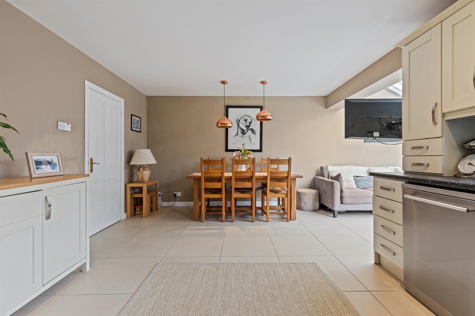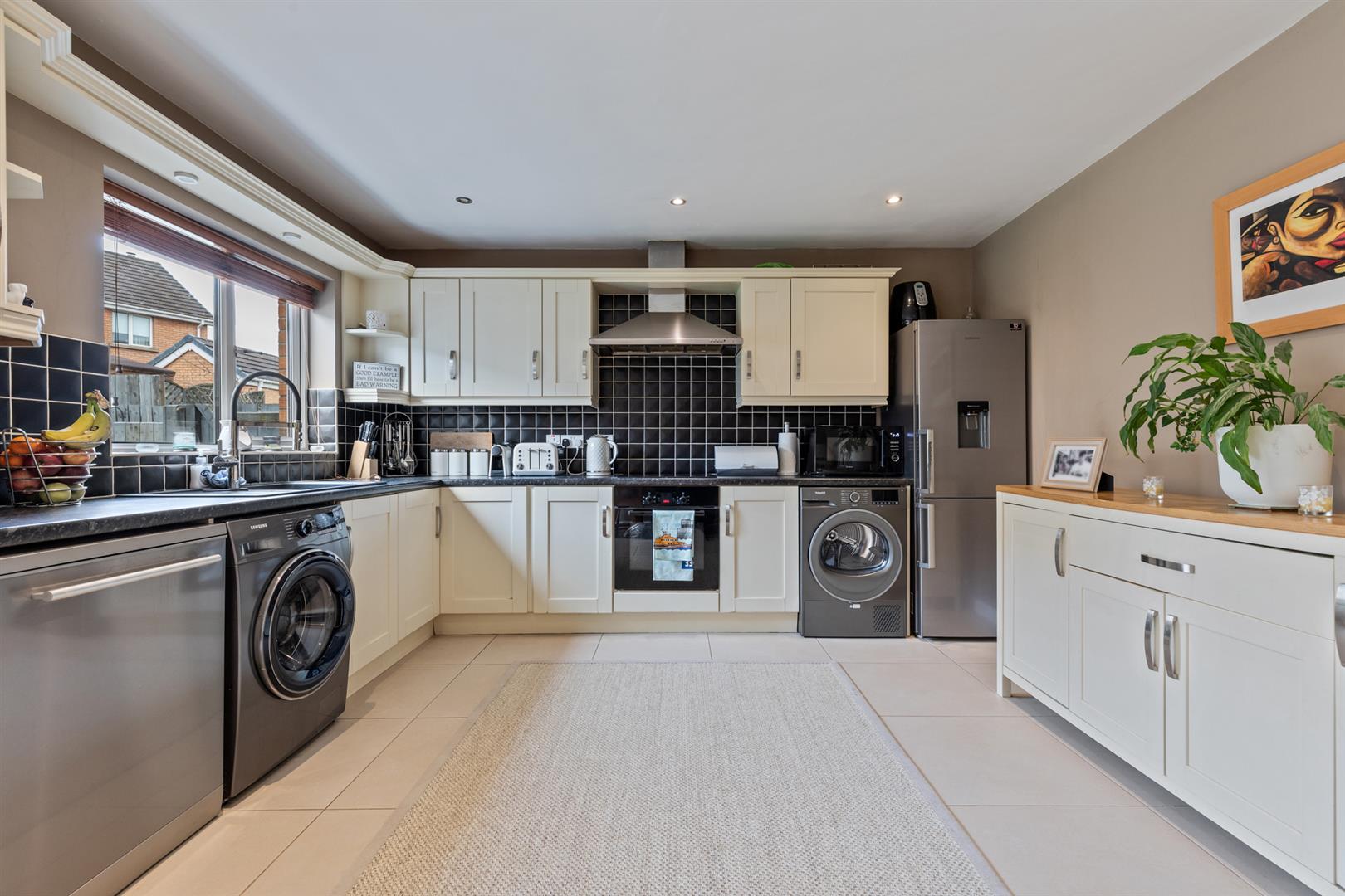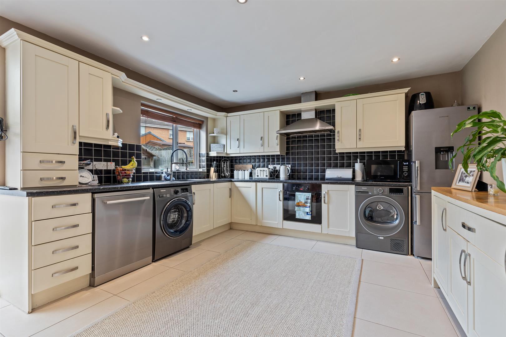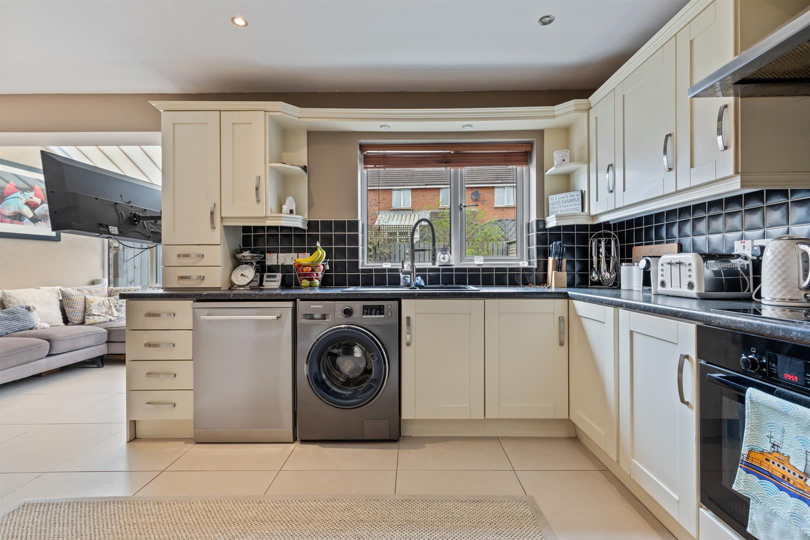 To the rear, the kitchen/dining area is fitted with a range of high and low level units and offers excellent space for everyday living. It includes integrated appliances, ample room for additional white goods and recessed spotlighting, while a lean-to conservatory provides further versatility and direct access to the rear garden.