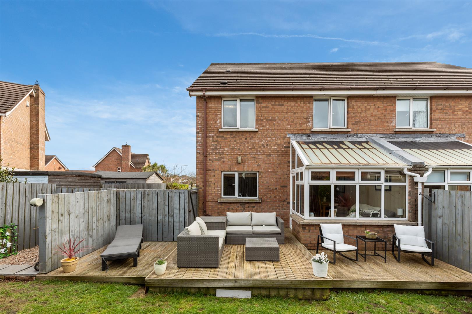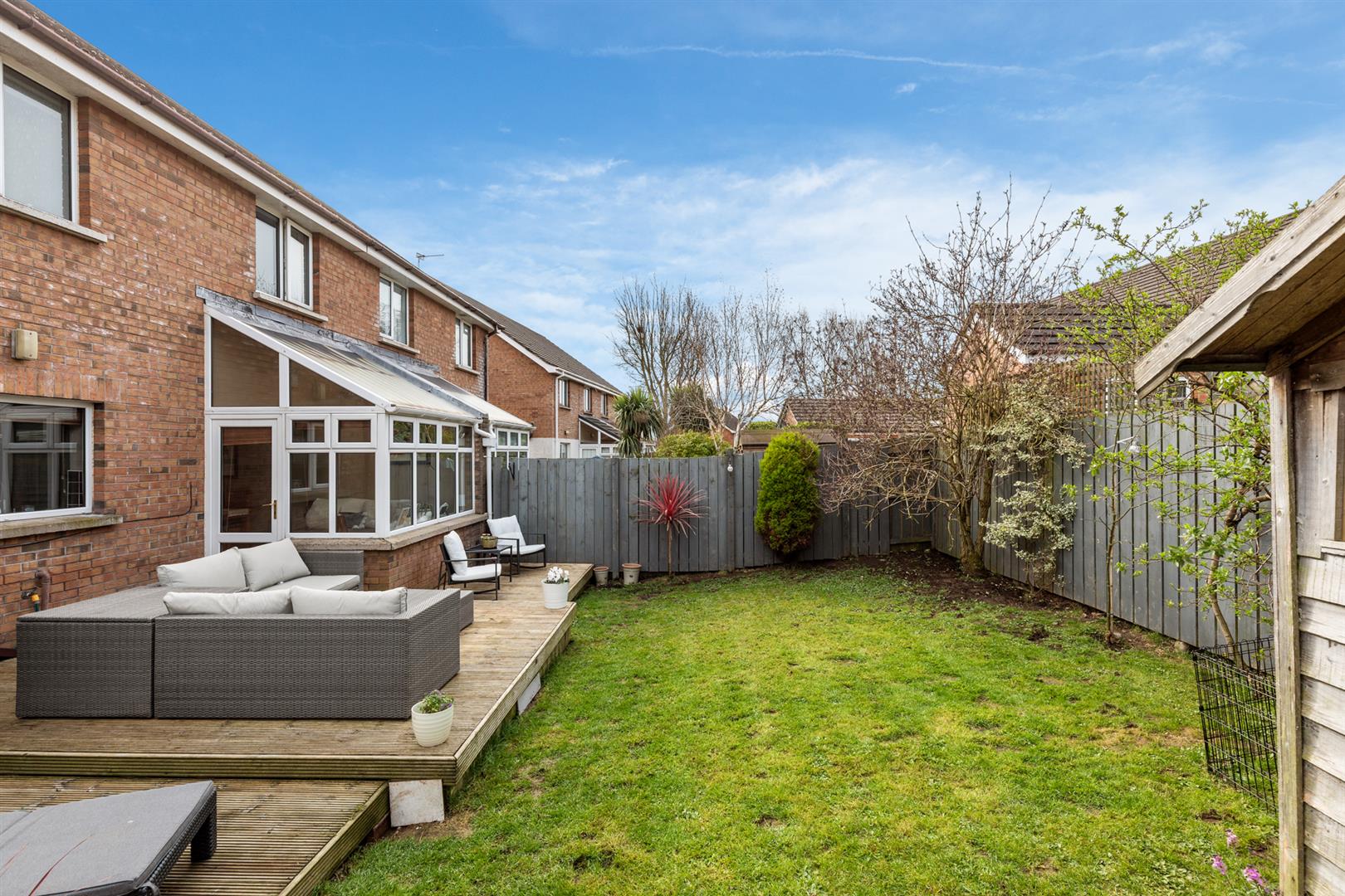 West-facing rear garden in lawn,fully enclosed with timber fencing, large raised decked area and space for shed.