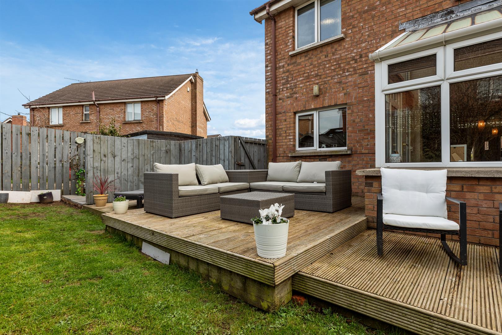 West-facing rear garden with large raised decked area