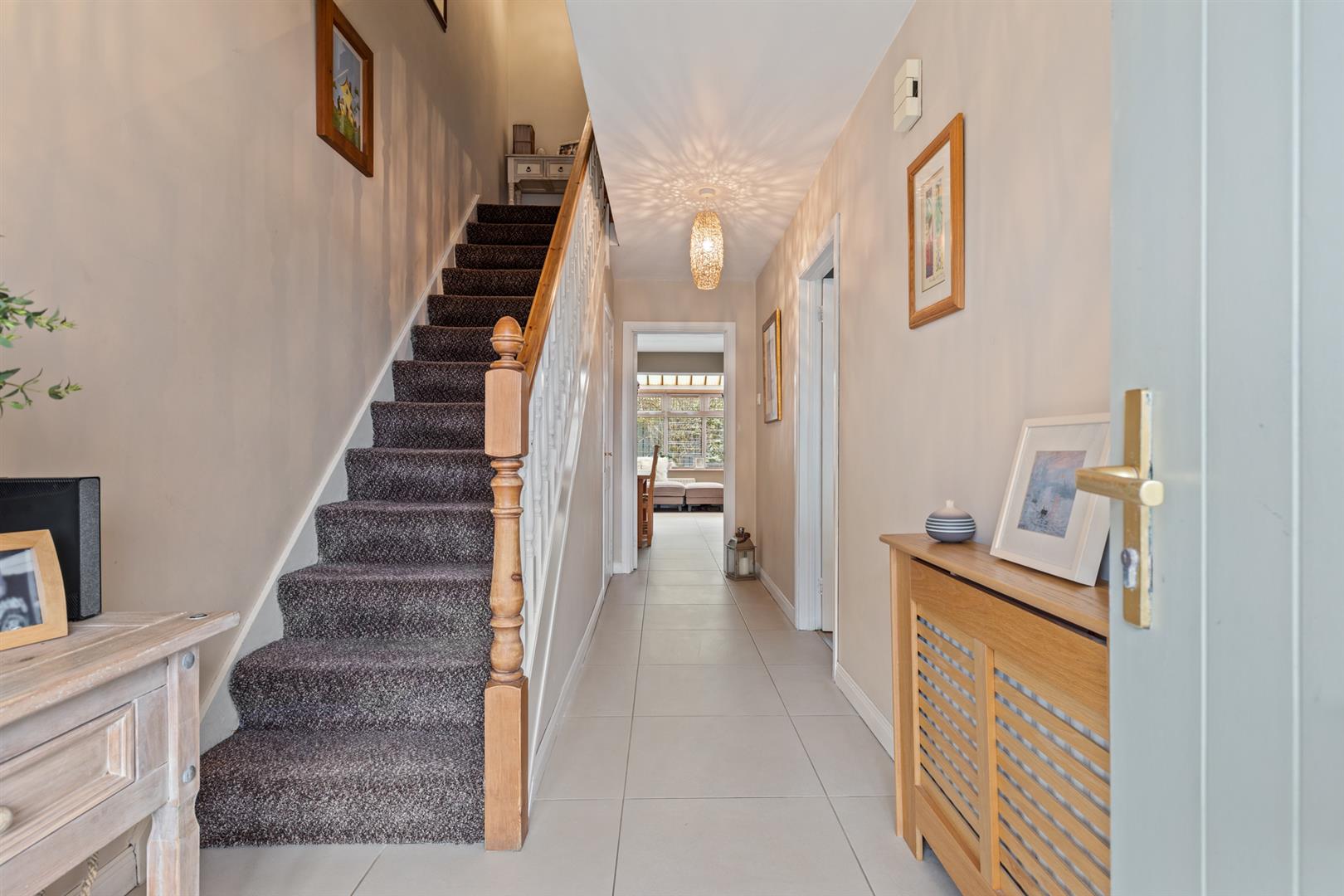 The ground floor comprises a welcoming entrance hall with tiled flooring and useful under stair storage. The spacious lounge features a bay window and an attractive fireplace with carved wooden surround, slate inset and hearth, creating a comfortable and inviting living space.