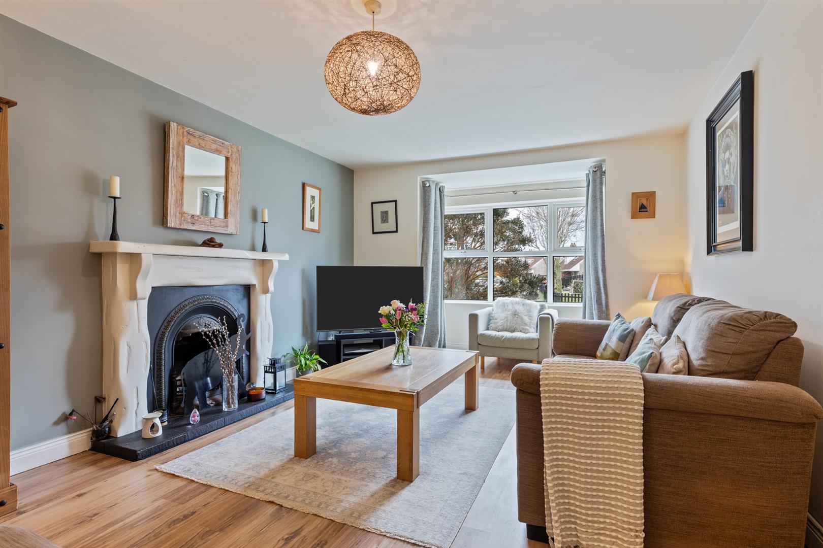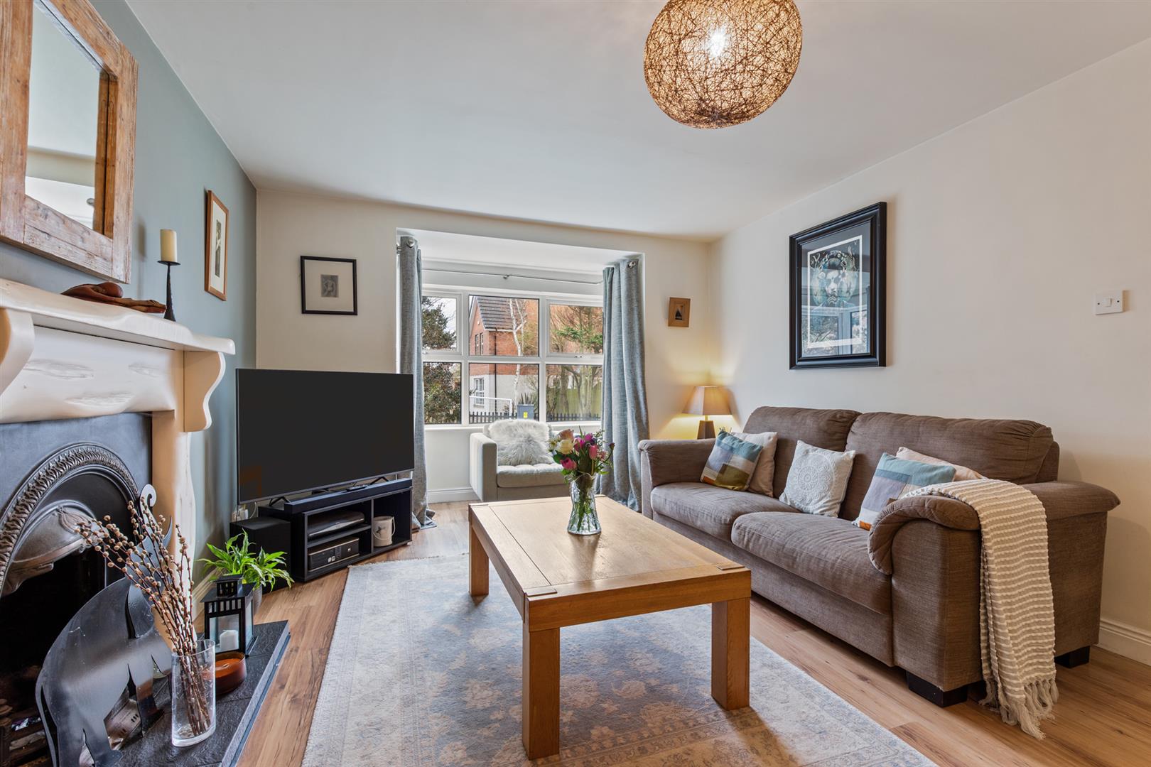 Bright lounge with bay window and feature fireplace