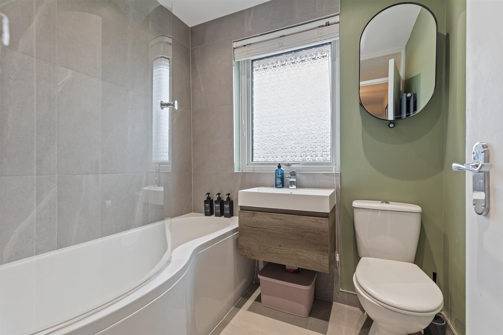 White suite comprising; panelled bath with mixer tap and shower attachment, glass shower screen, vanity unit with mixer tap and storage, low flush w/c, tiled floor, part tiled walls, recessed spotlights, extractor fan.