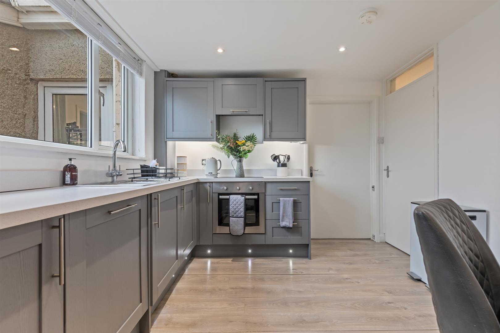 Wood laminate flooring, range of high level units, back door to enclosed rear garden.