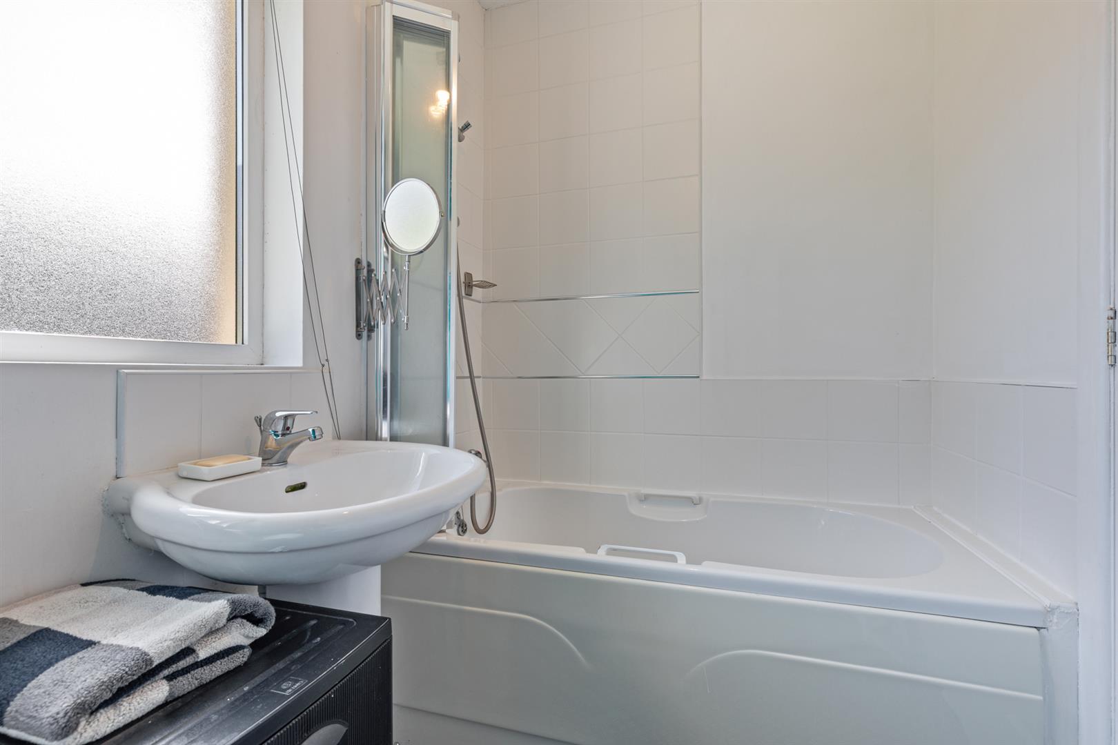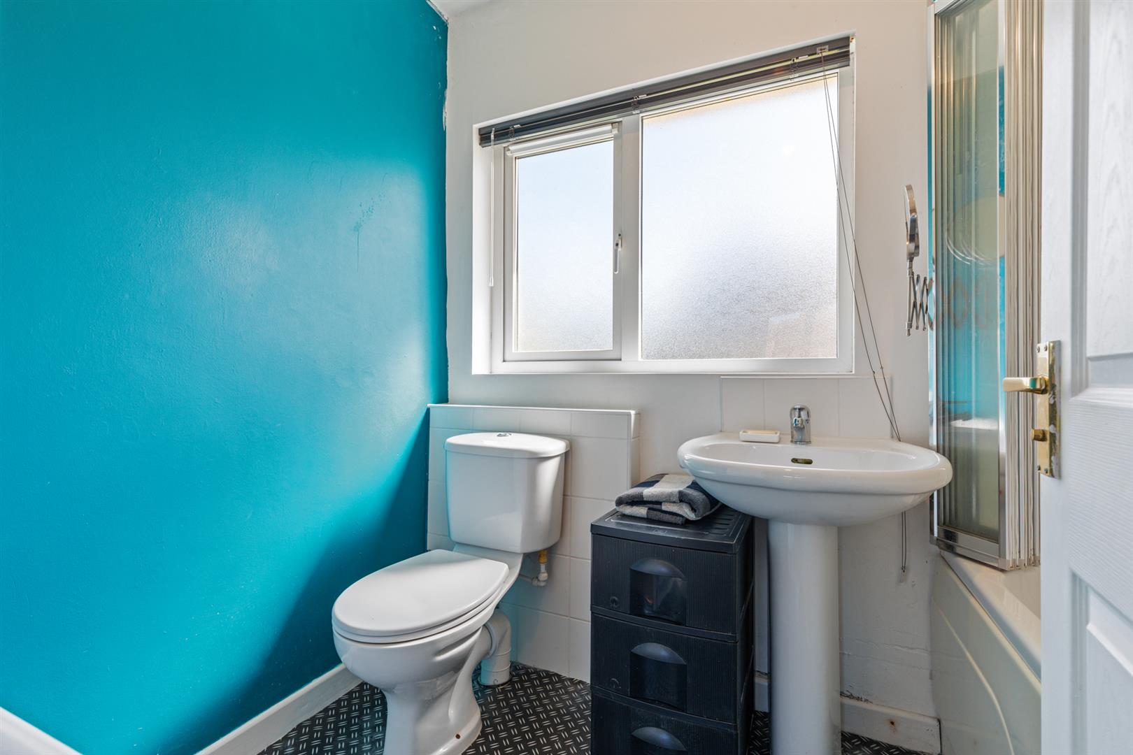 White suite comprising panelled bath with mixer taps and overhead shower attachment, glazed shower screen, pedestal wash hand basin wiht mixer taps and tiled splashback, low flush wc, partly tiled walls and extractor fan.