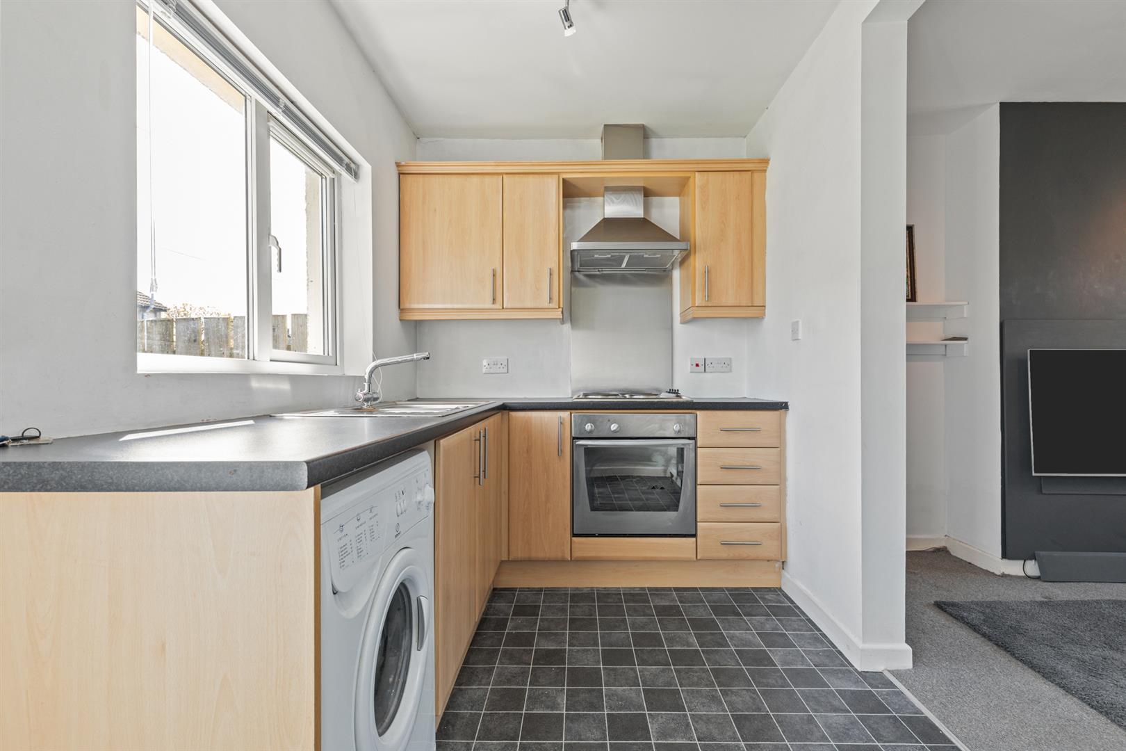 Range of high and low level units with laminate work surfaces, built in drainer one and a quarter bowl stainless steel sink unit with mixer tap, integrated appliances to include; oven, four ring hob and stainless steel extractor fan, space for fridge freezer, plumbed for washing machine, access to roofspace and door to rear garden.