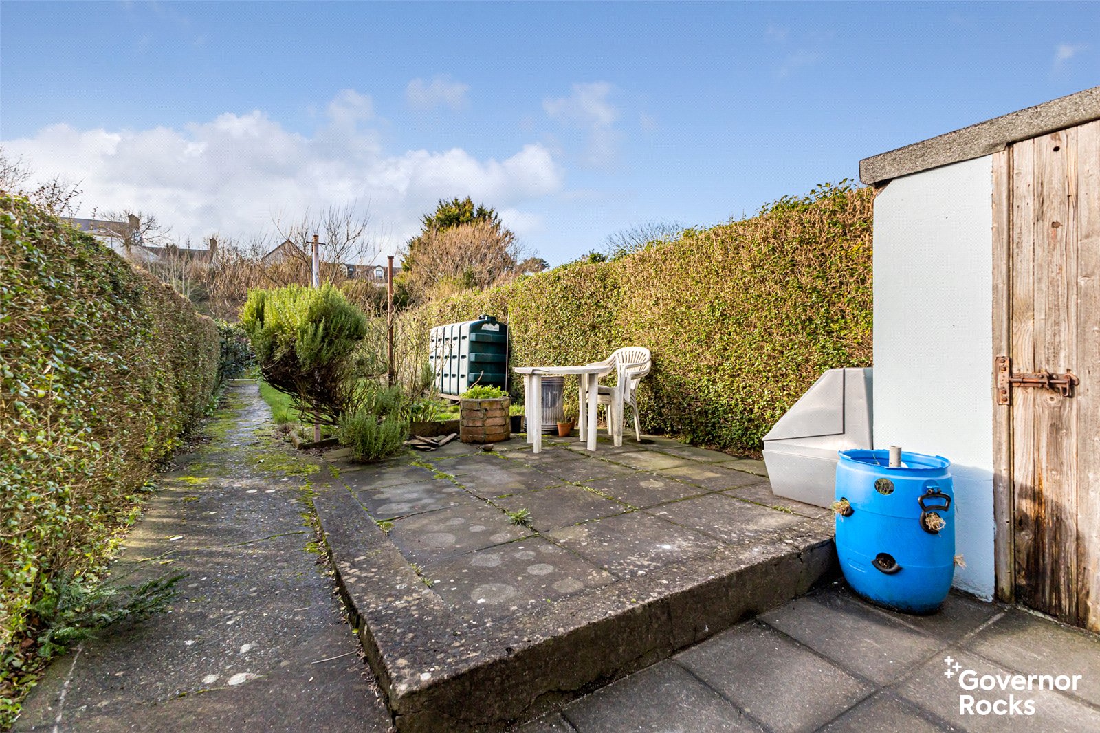 To the rear is a private enclosed garden with mature plants, while on-street parking is available to the front.
