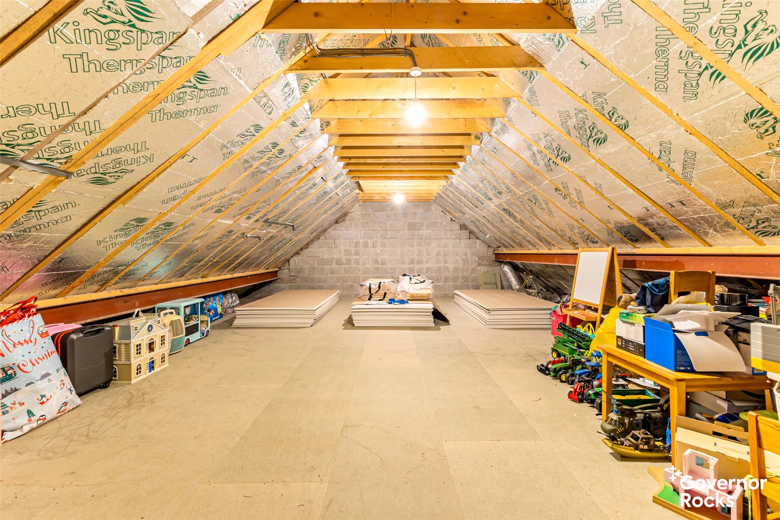 The accommodation includes three well-proportioned double bedrooms. The principal bedroom benefits from a stylish, recently refurbished en-suite shower room, while the remaining bedrooms are served by a traditional bathroom fitted with a three-piece suite. From the hallway, stairs lead to the loft which currently provides two very large loft rooms and an excellent storage cupboard, offering clear potential for conversion to additional living or sleeping accommodation (subject to the necessary planning and building control approvals).