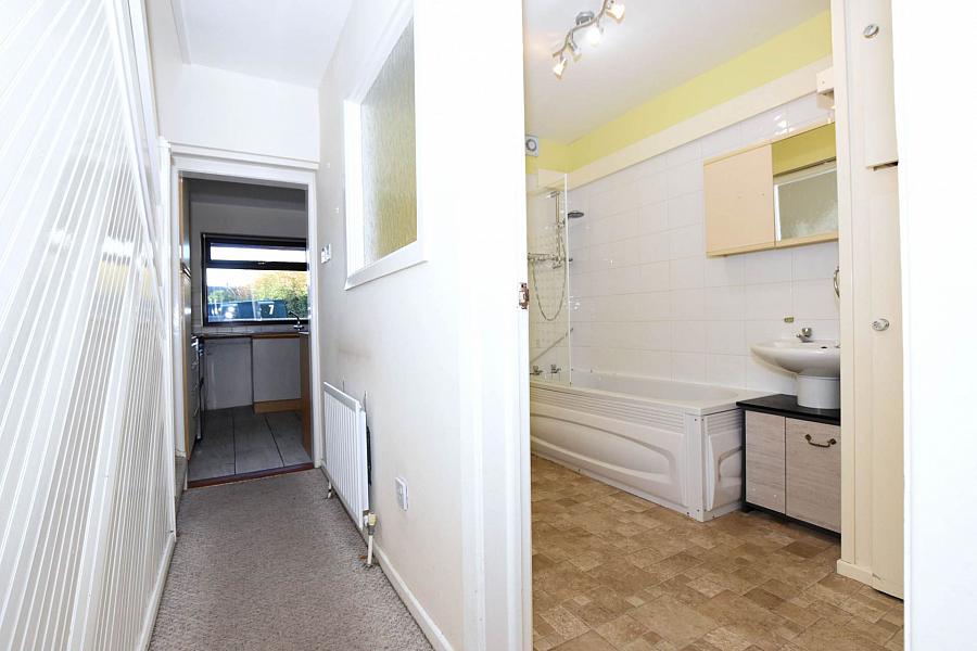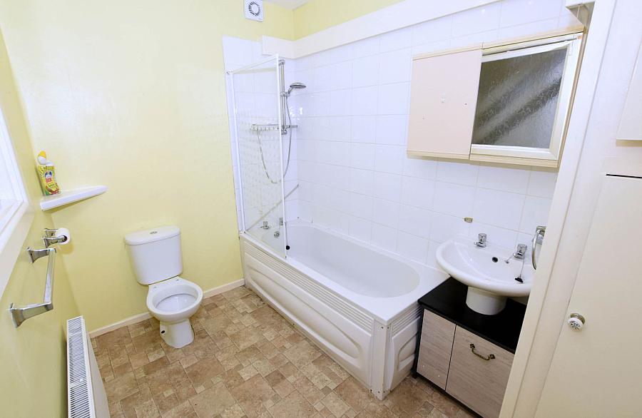 Panel bath with shower over. Low flush w.c. Wash hand basin. Part wall tiling. Hotpress.
