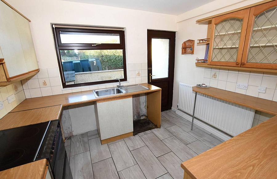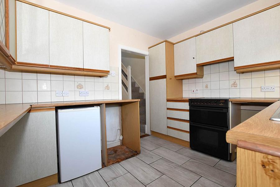 Single drainer stainless steel sink unit. Good range of fitted high and low level kitchen units with glazed display cabinets and roll edged worktops. Plumbed for washing machine. Part wall tiling.