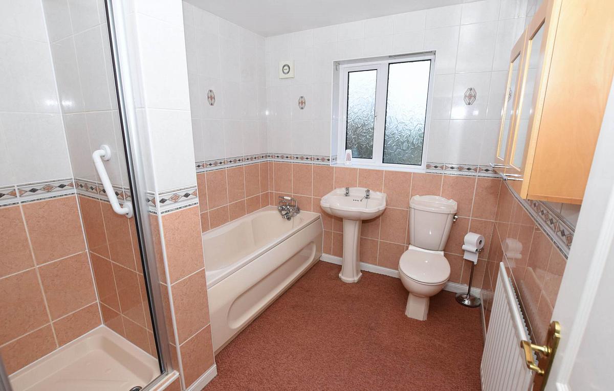 Panel bath with telephone hand shower. Pedestal wash hand basin. Low flush w.c. Shower cubicle with electric shower. Full wall tiling.