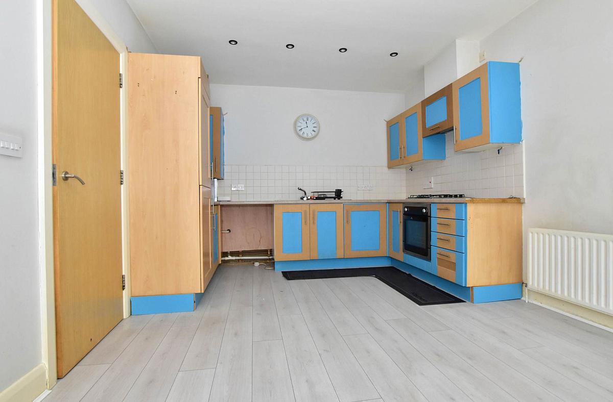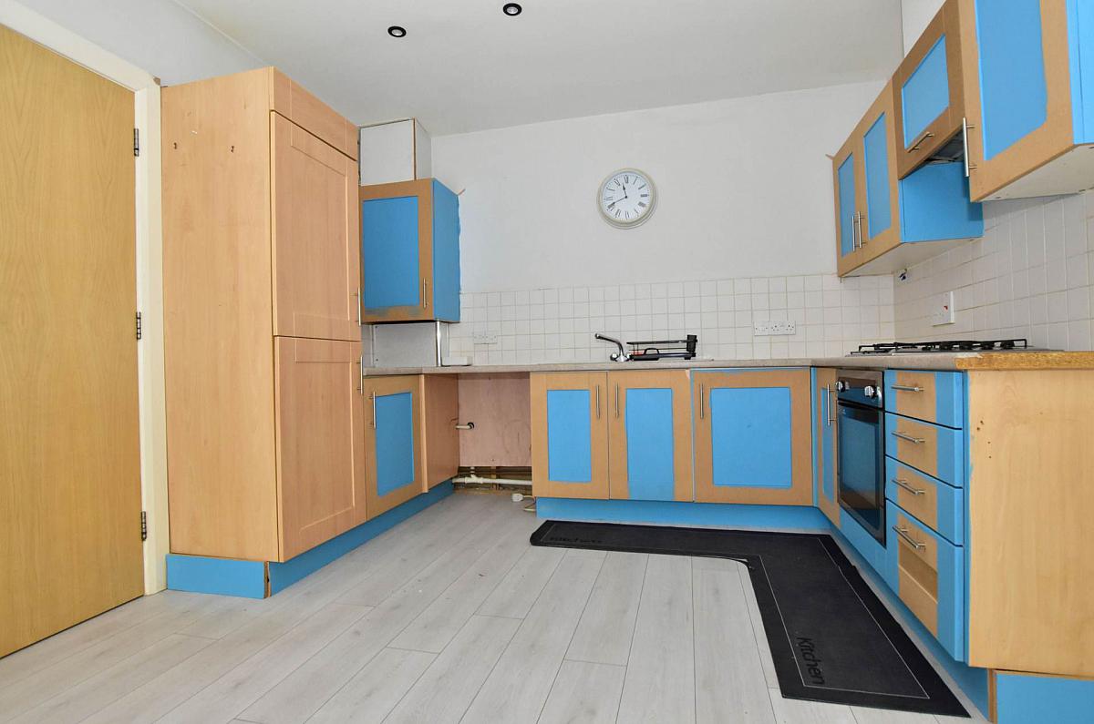 Single drainer stainless steel sink unit. Good range of fitted high and low level kitchen units with laminate work tops. Four ring gas hob and built in under oven. Pat wall tiling. Laminate floor.