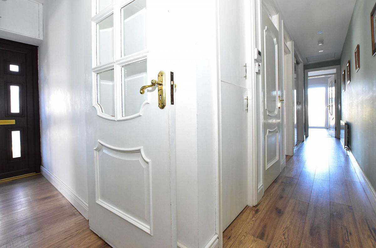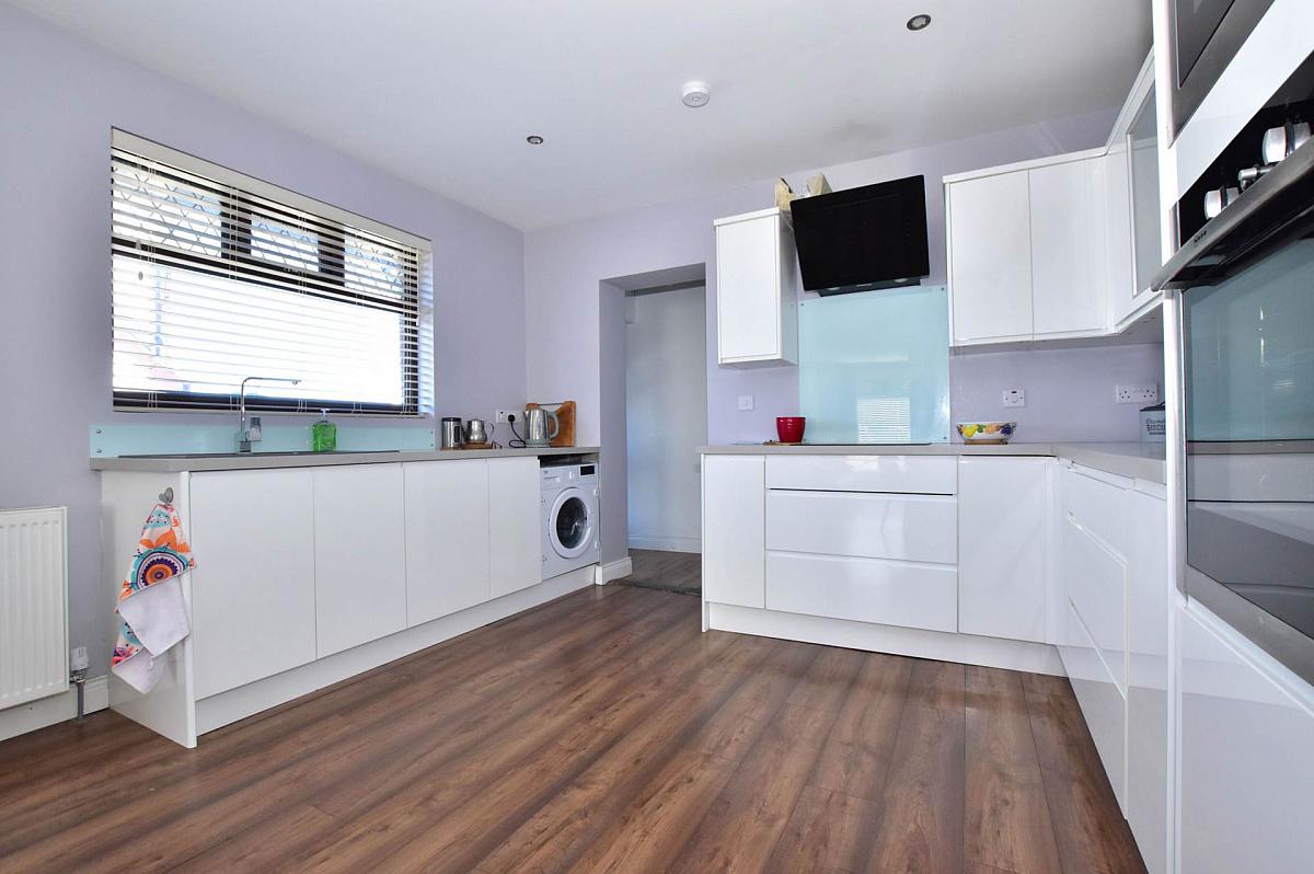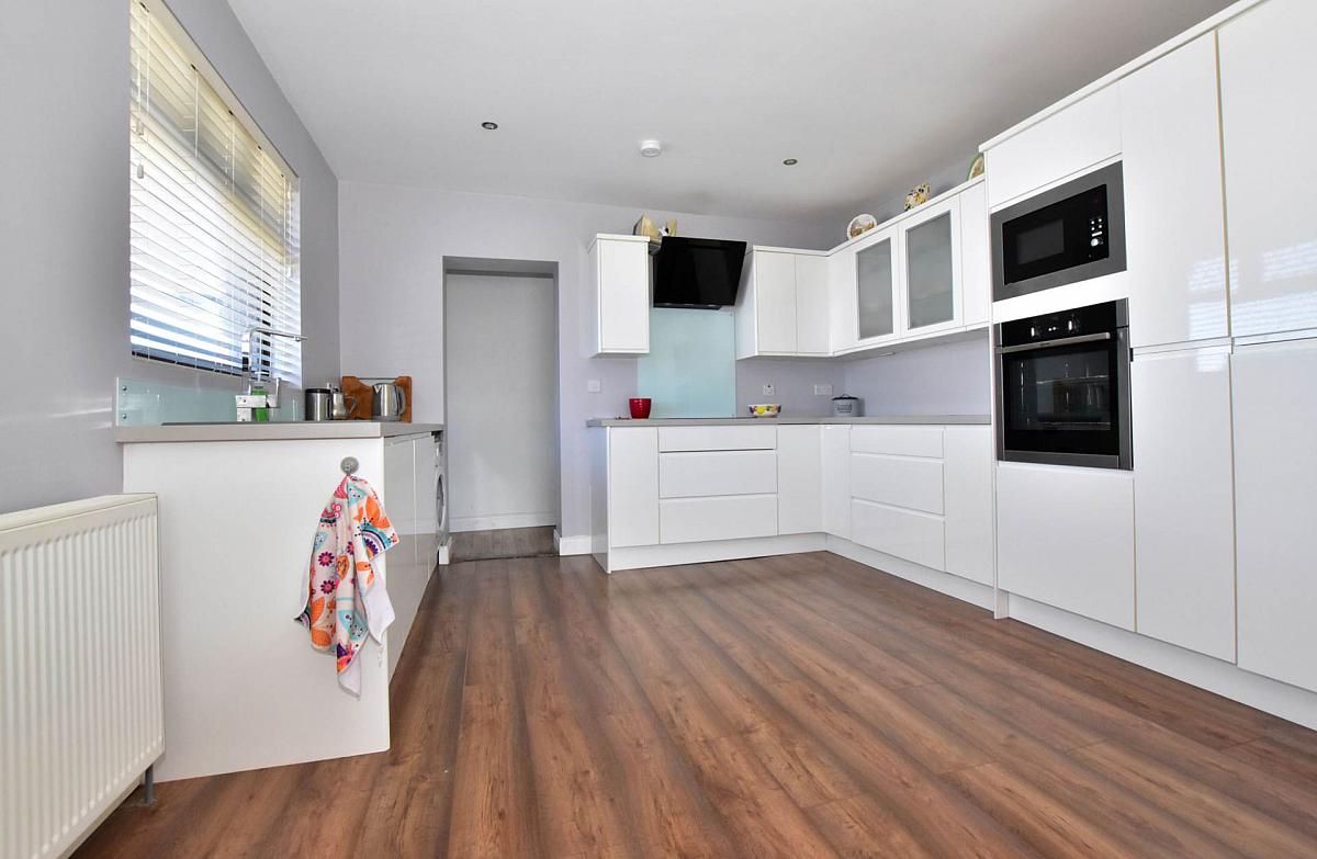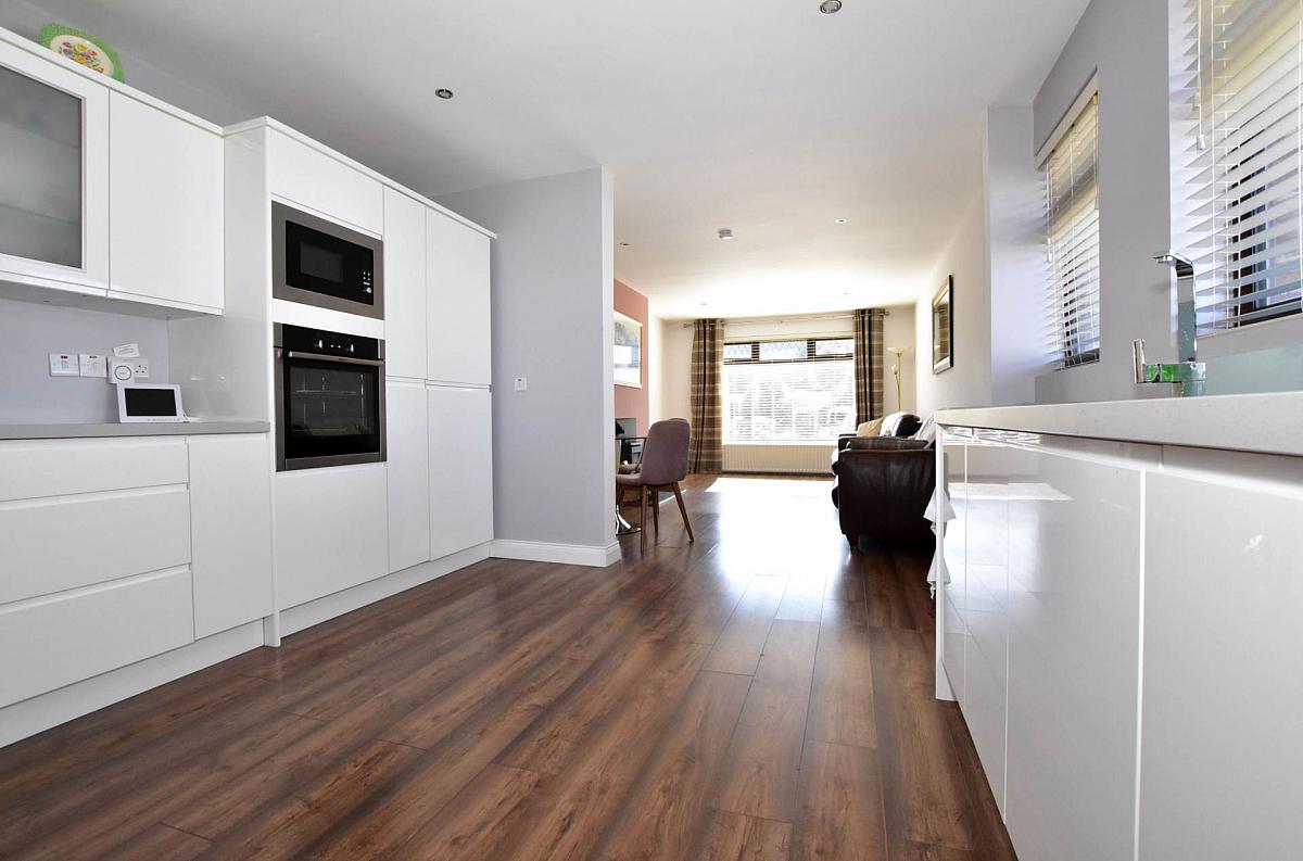 Single drainer sink unit with mixer taps. Good range of fitted high and low level kitchen units with glazed display cabinets and laminate work tops. Four ring electric hob and separate built in oven. Integrated fridge freezer and washing machine.