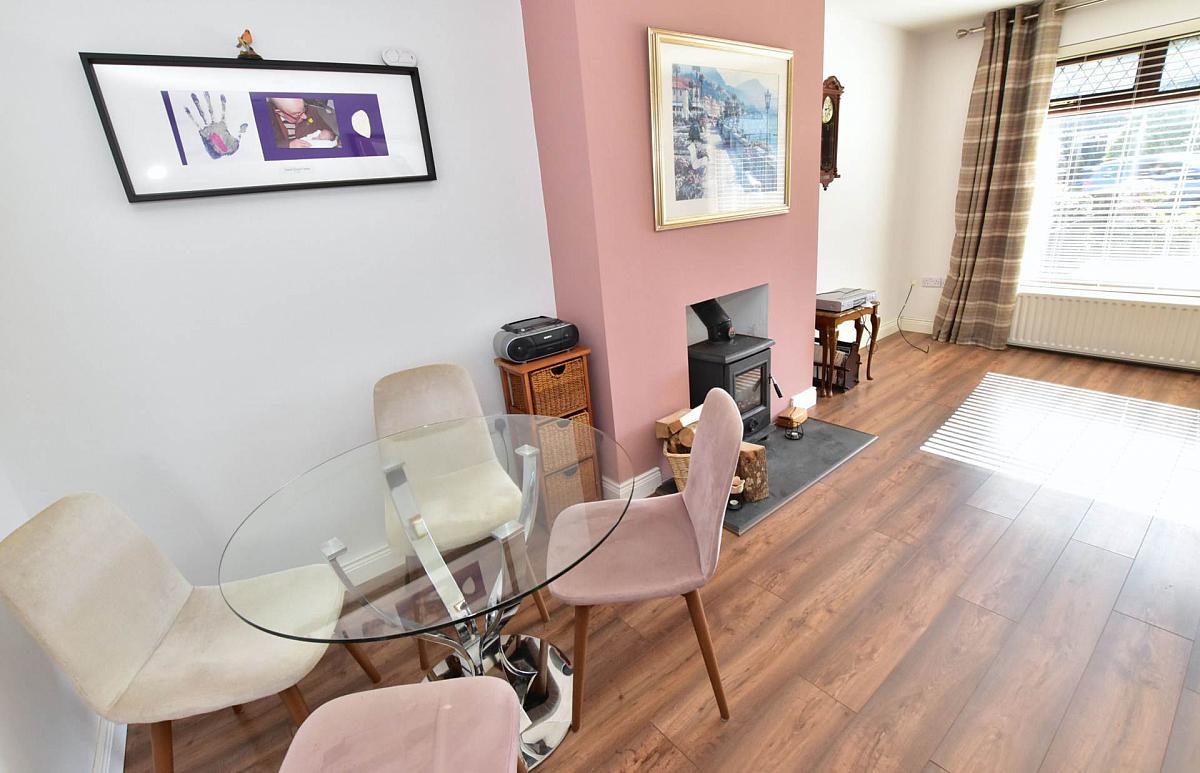 Free standing multi burning stove with slate hearth. Laminate wooden floor. Open to: