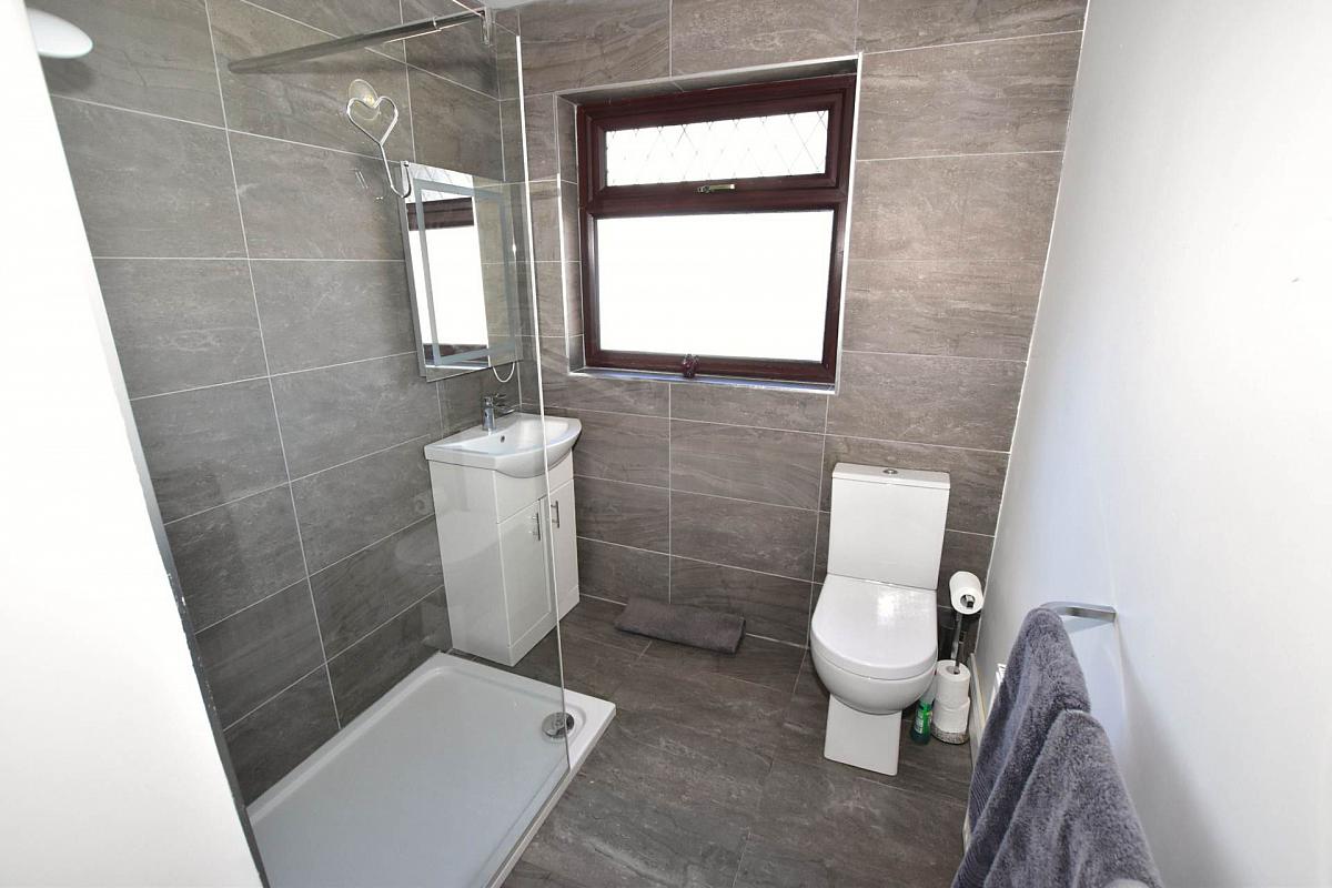 Vanitory unit. Low flush w.c. Shower cubicle with electric shower. Part wall tiling. Ceramic tiled floor.