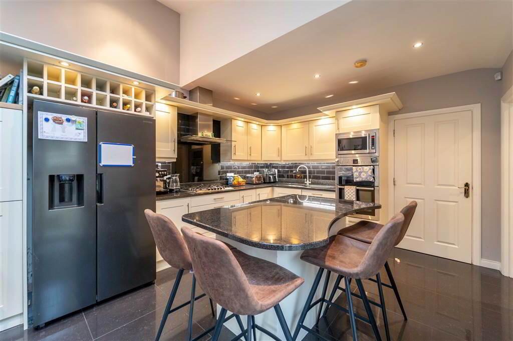 Luxury fitted Kitchen with an excellent range of high and low level ‘Shaker’ style units with complimentary Granite Worktops and a matching Island Unit. Integrated Appliances include a Stainless Steel Sink Unit, Dual Ovens, a Microwave, a five ring Gas Hob and is plumbed for an ‘American’ style Fridge / Freezer.